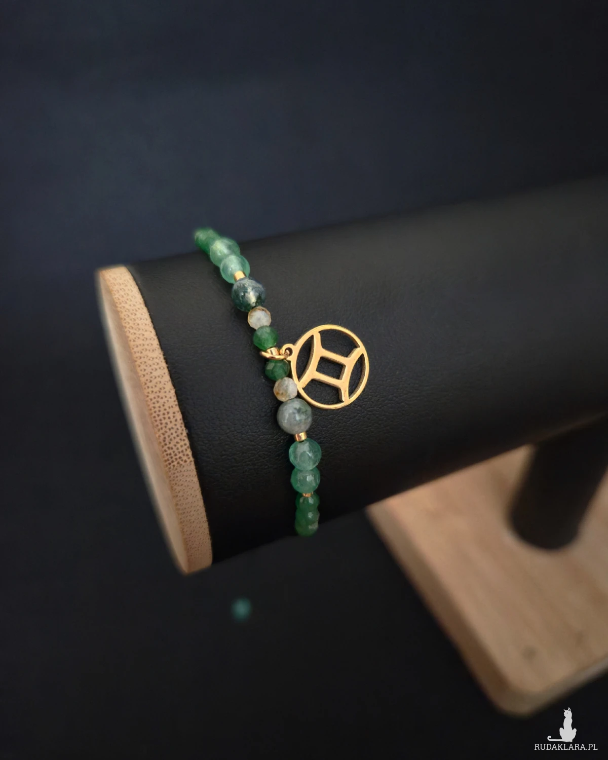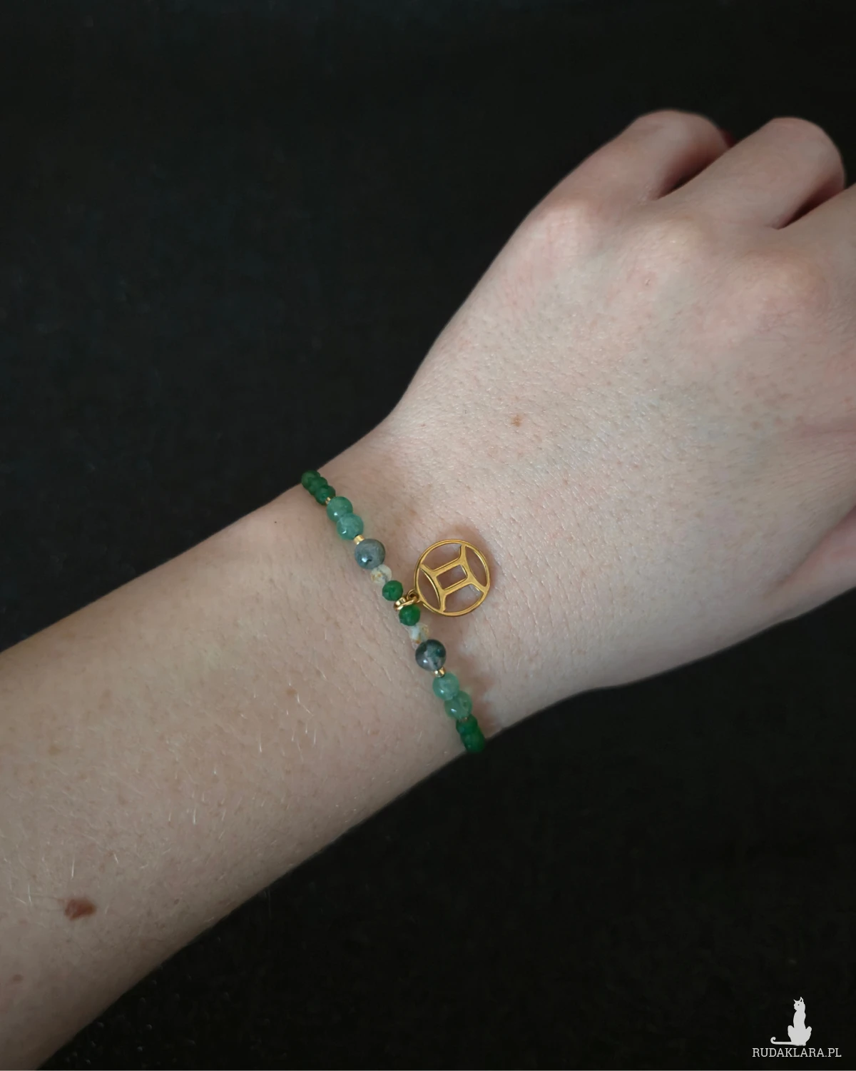 Bransoletka Zodiakalna „Bliźnięta” to lekka, świeża i pełna energii kompozycja stworzona z myślą o osobach urodzonych pod znakiem Bliźniąt — ciekawych świata, komunikatywnych, elastycznych i otwartych na zmiany. Zielona paleta barw kamieni, przełamana złotymi akcentami, symbolizuje rozwój, ruch i nowe możliwości. Złota zawieszka z symbolem Bliźniąt podkreśla indywidualny charakter bransoletki, czyniąc ją osobistym talizmanem komunikacji i wewnętrznej harmonii.