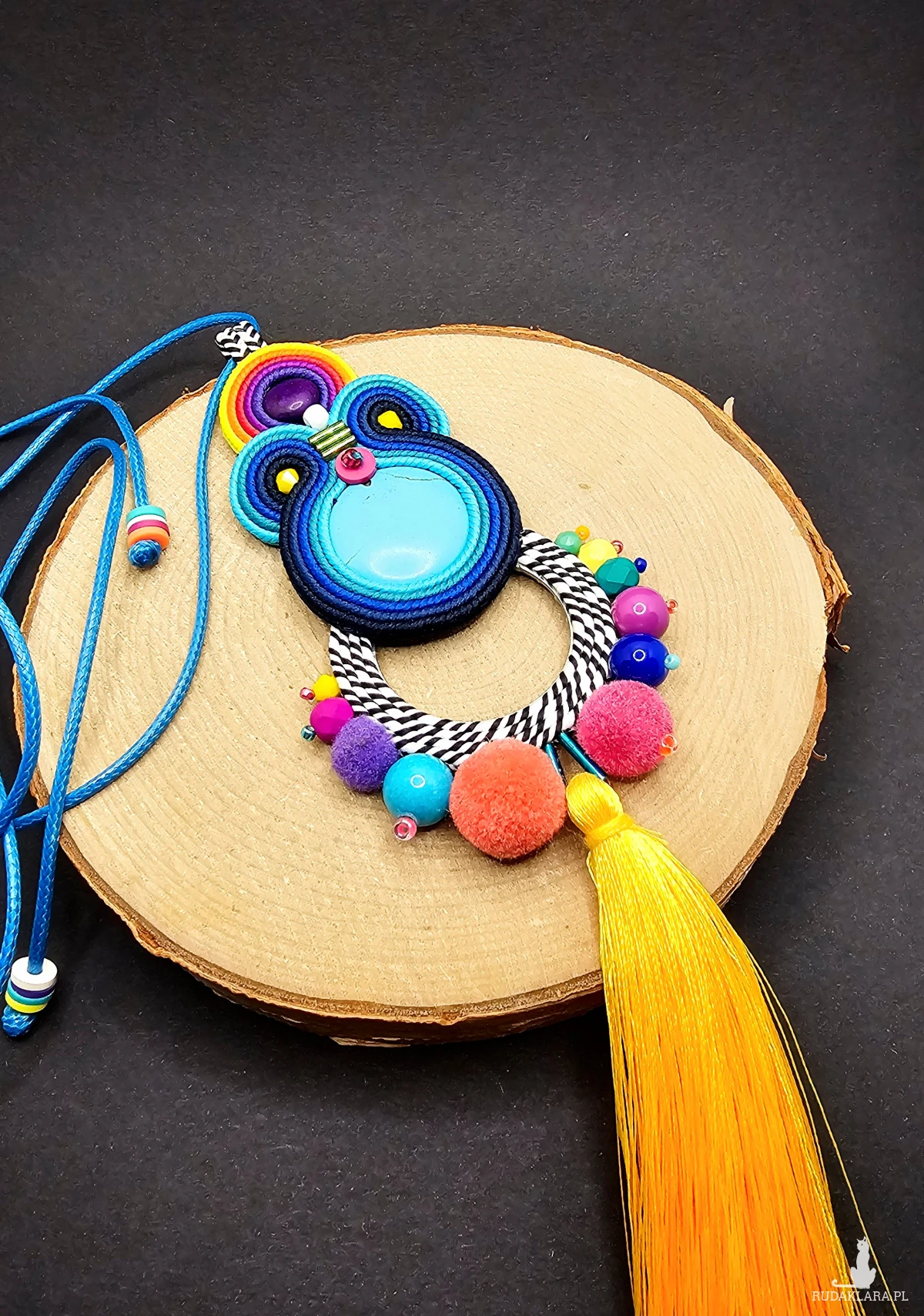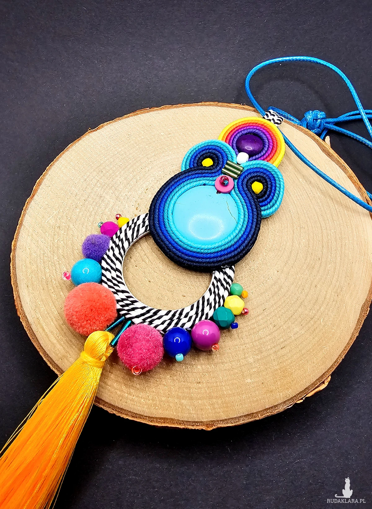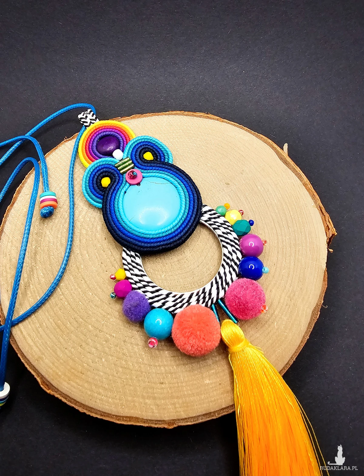 Kaboszony z kolorowych howlitów otoczone polskimi sznurkami sutasz oraz szklanymi czeskimi i japońskimi koralikami o różnych kształtach i wielkościach. Dół wisiora ozdobiony metalową bazą z czarno-białym sznurkiem oraz kolorowymi pomponami i szklanymi koralikami. Dół wisiora zakończony długim żółtym chwostem. Wisior zawieszony na turkusowym powlekanym sznurku z możliwością regulacji długości.