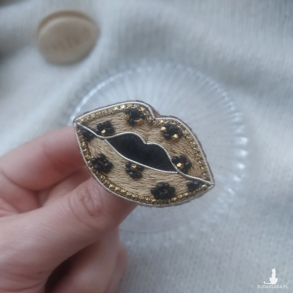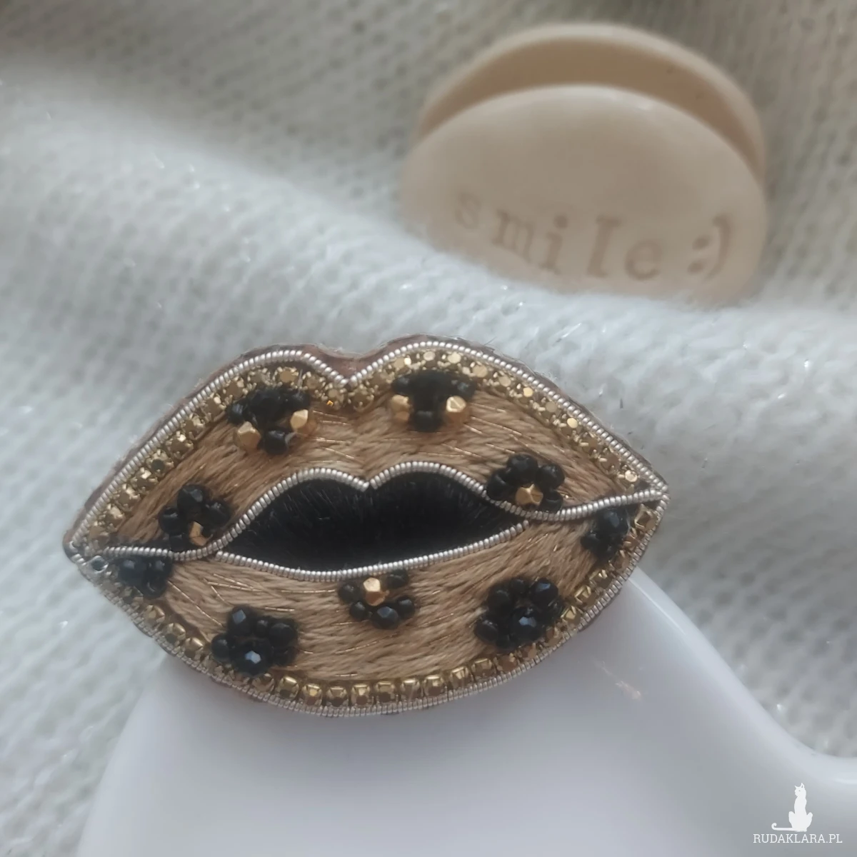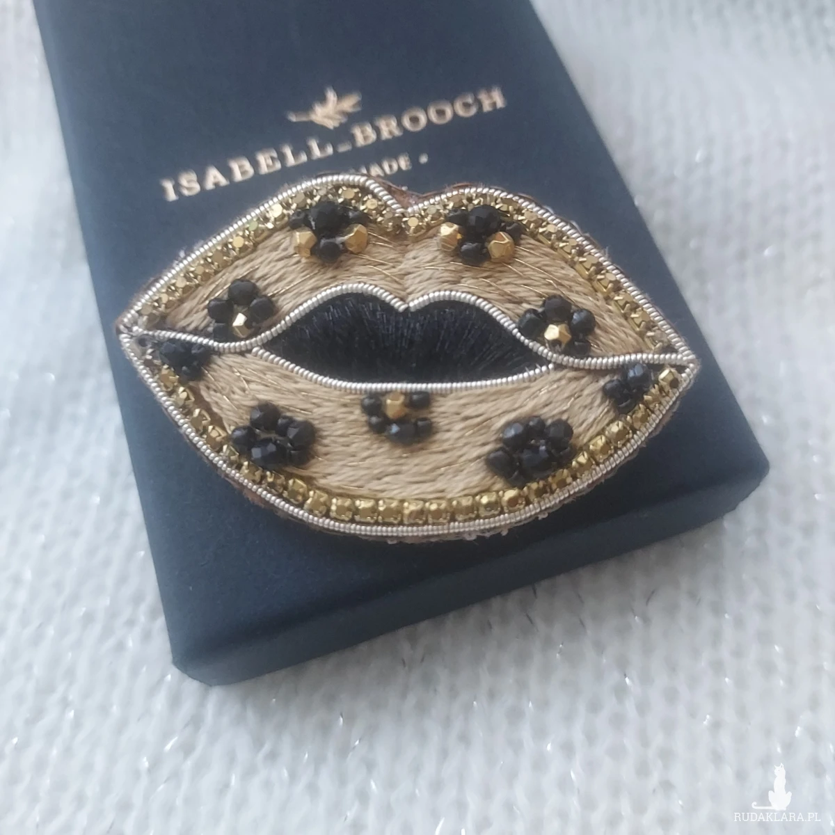 Mam dla Ciebie uroczą broszkę CAŁUŚNE USTA w panterkę w złotym wykończeniu.