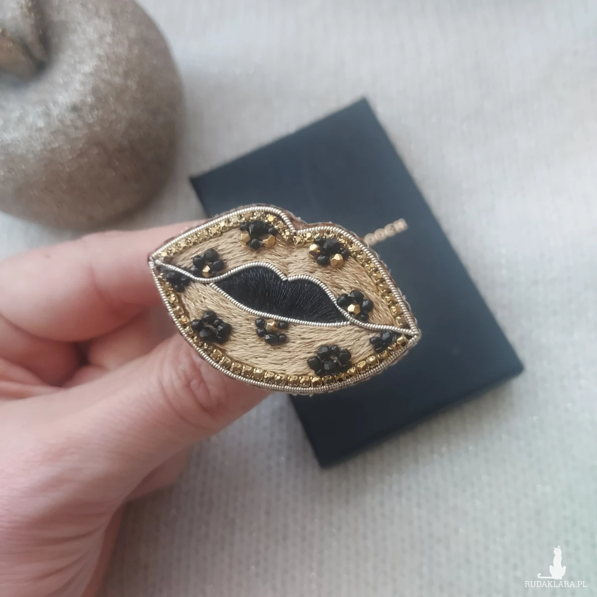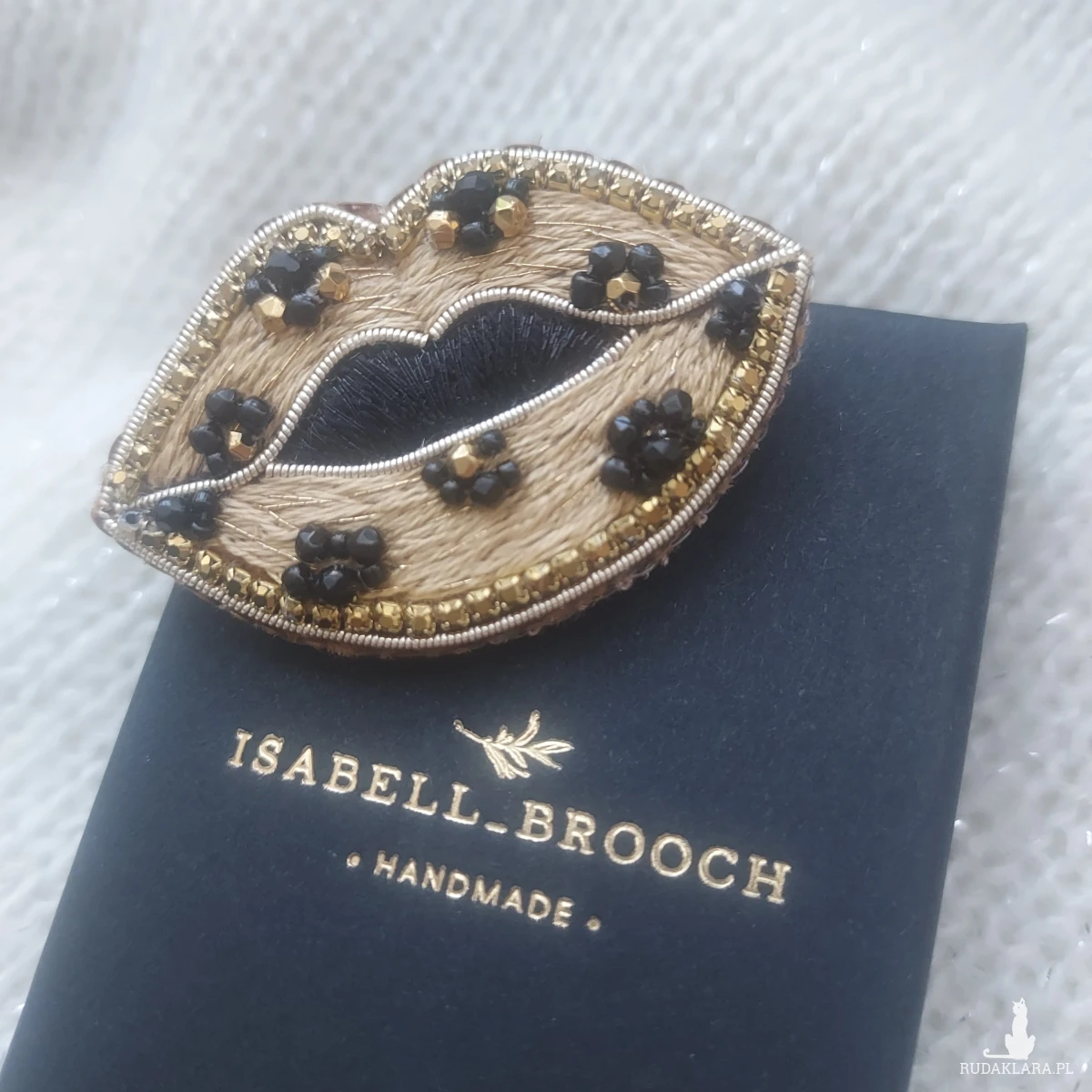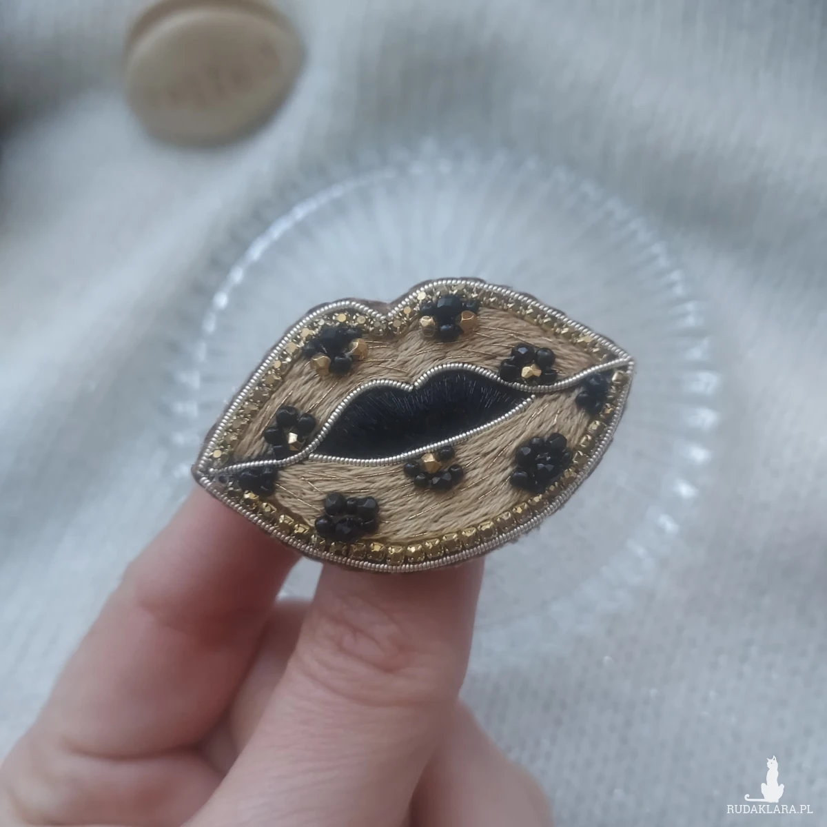 Mam dla Ciebie uroczą broszkę CAŁUŚNE USTA w panterkę w złotym wykończeniu.