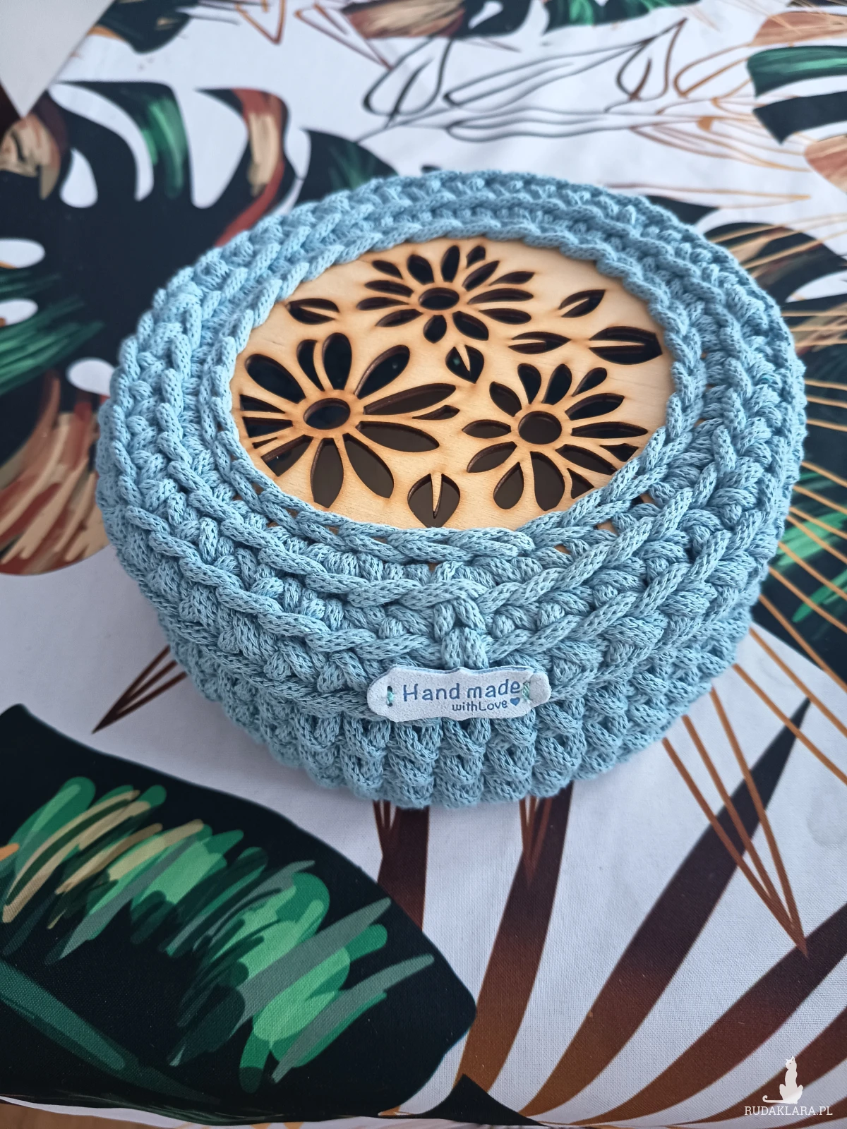 Koszyczek-szkatułka wykonany na szydełku z sznurka bawełnianego na bazie z sklejki. Koszyczek ma wieczko z ozdobnym ażurem. Jest bardzo praktyczne, będzie ozdobą każdego pomieszczenia. Dzięki kolorowi sznurka doda energii pomieszczeniu, w którym go postawimy. Sprawdzi się idealnie jako szkatułka do przechowywania biżuterii lub innych drobiazgów. Idealny dla każdej pani tej małej, czy dużej, młodej czy starej. Wymiary koszyczka średnica 17cm, a wysokość 6cm. Mogę zrobić koszyczek na zamówienie w innym kolorze.
