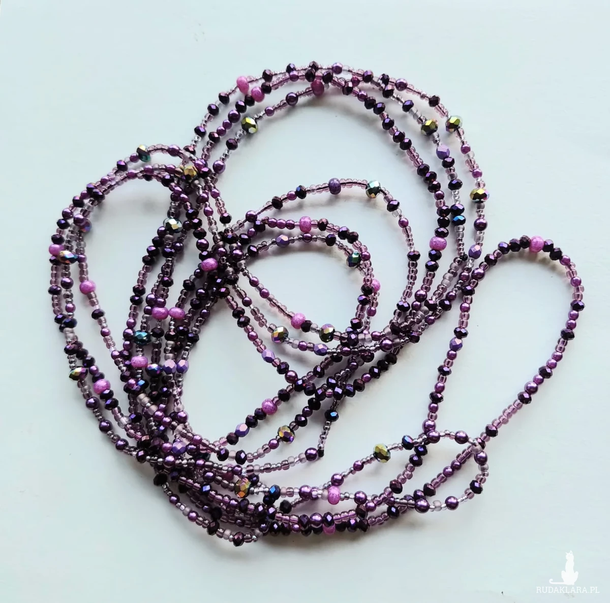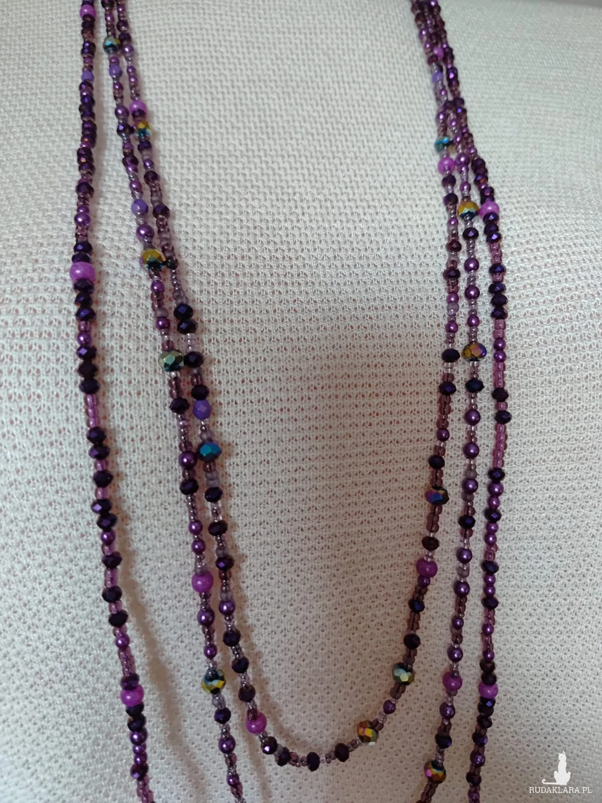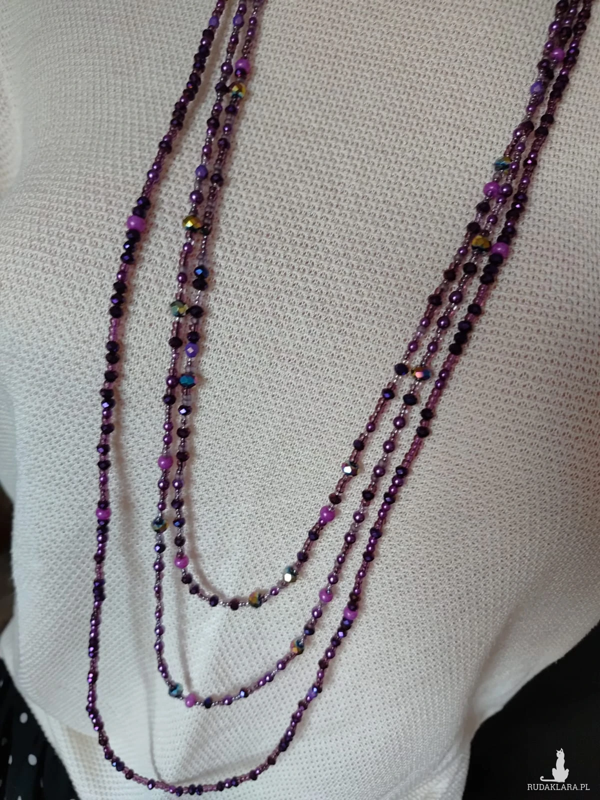 Trzy sznurki korali z perełek i kryształków w kolorze purpury. Bez zapięcia. Przekładane przez głowę co jest wygodne zwłaszcza dla osób starszych mających problem z małymi zapięciami. Długość sznura krótkiego 41 cm, sredni sznur 46 cm i najdłuższy sznur 54 cm Każdy sznur można nosić oddzielnie.