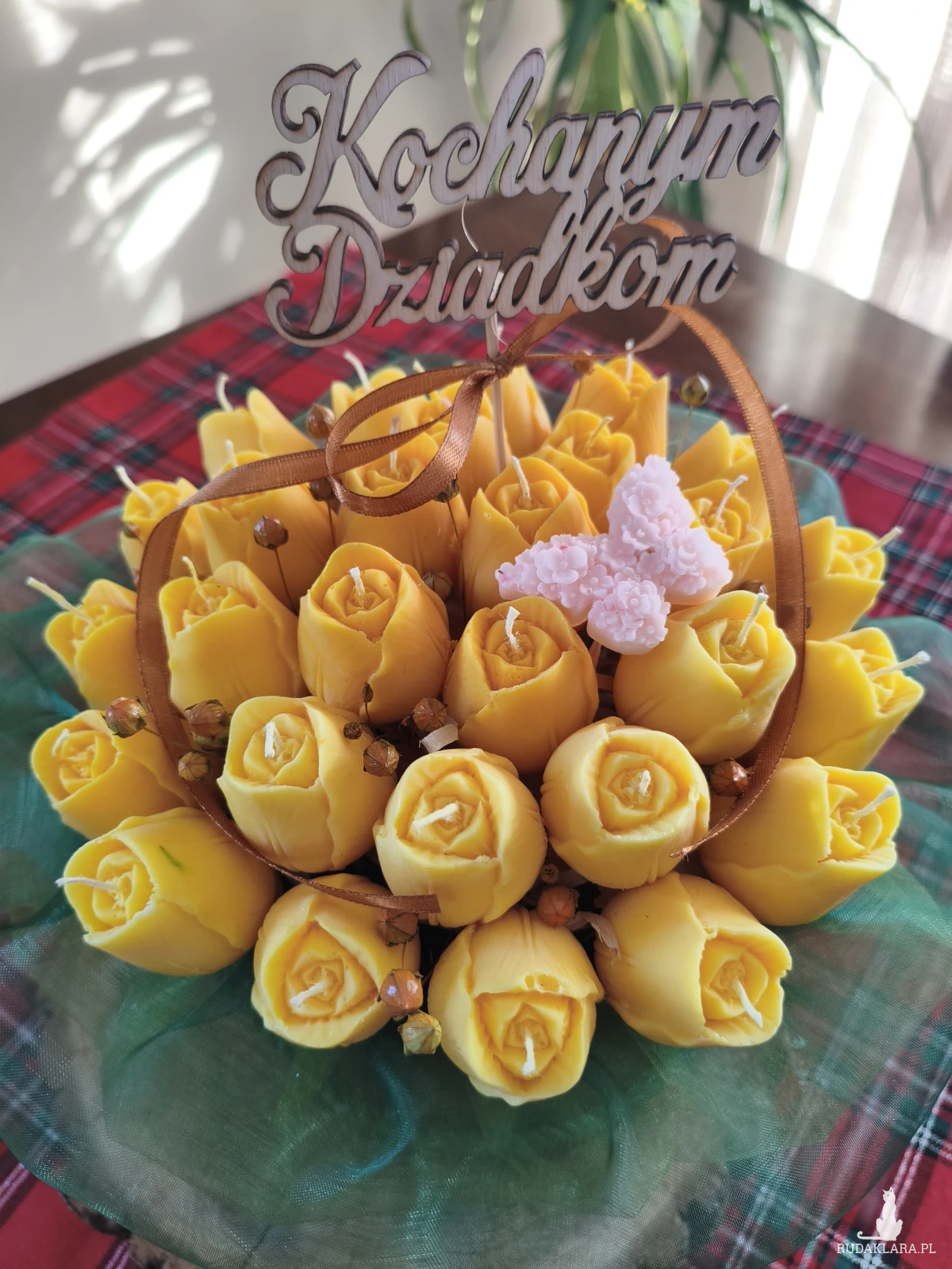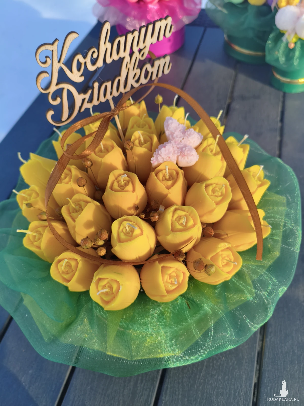 Flower box zawiera główki kwiatów które po wyciągnięciu z bukietu można zapalić. Flower box wysyłam zapakowany w celofan, wstążkę i bukiecik ze suszu oraz instrukcją palenia świec - gotowy do wręczenia jako prezent.