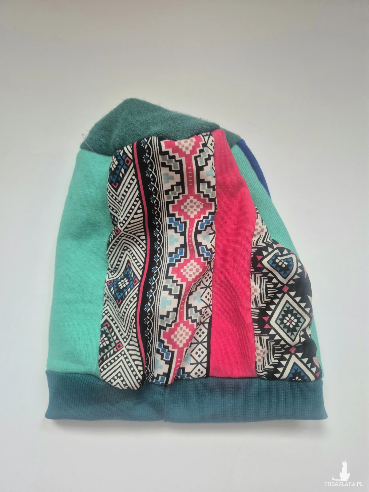 Czapka damska Smerfetka patchworkowa, na podszewce dobra na codzienne noszenie, wykonana w pojedynczym egzemplarzu rękodzieło polecam boks a1