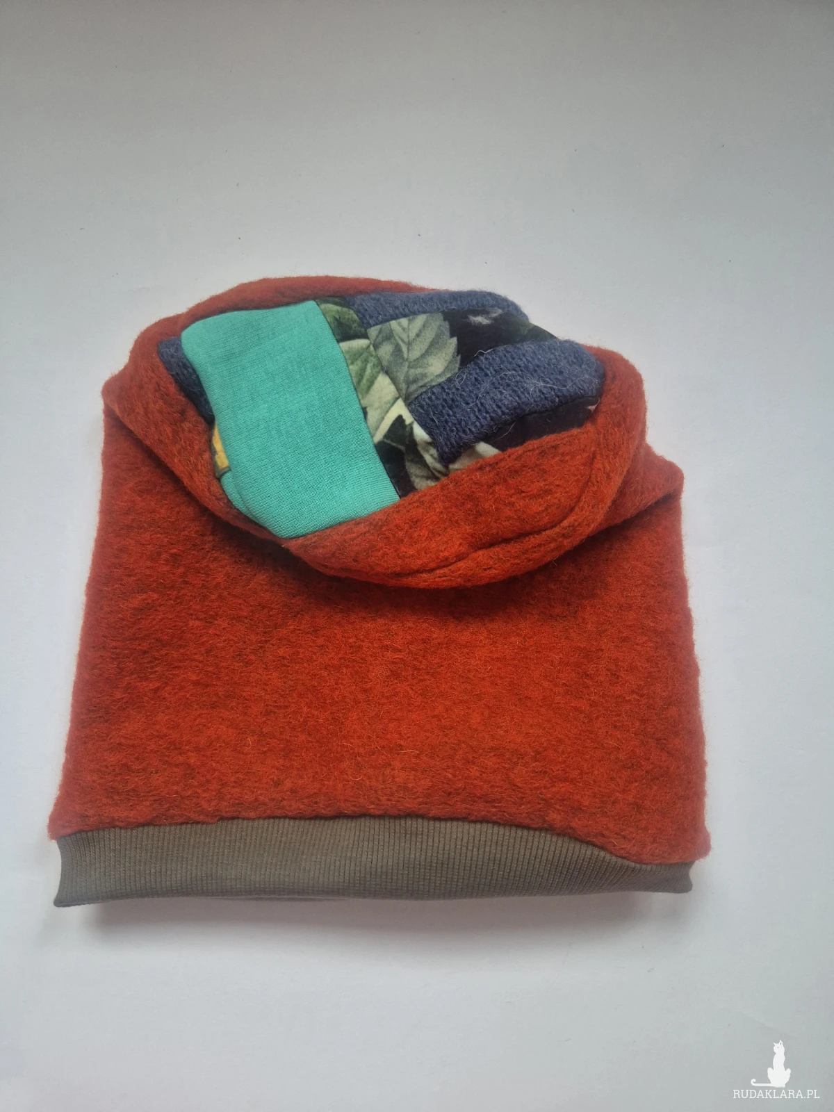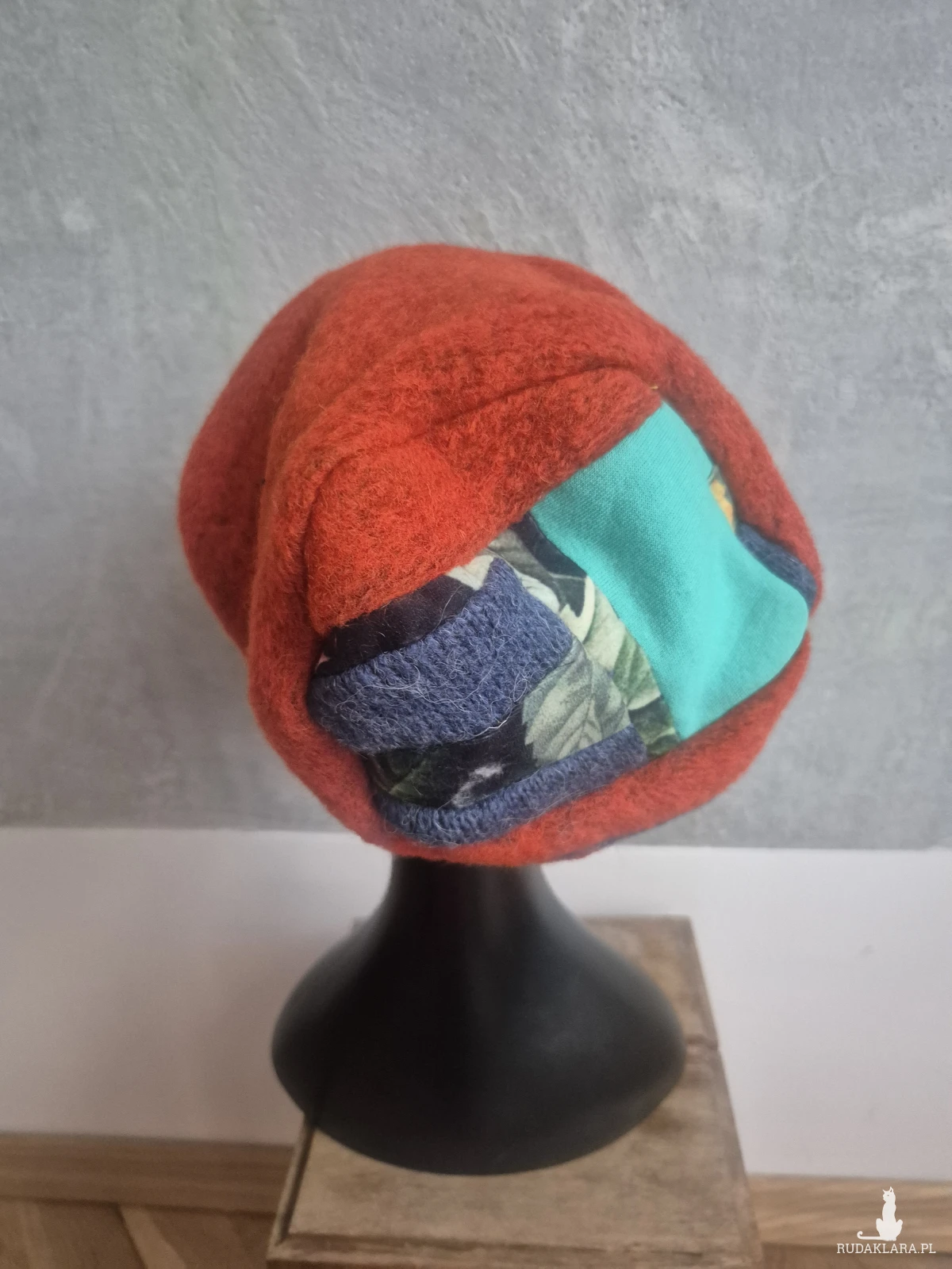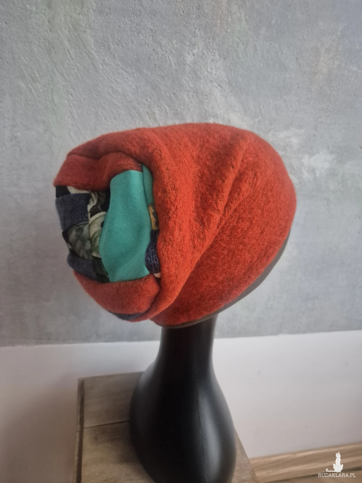 Ciepła czapka pomarańczowo-turkusowa góra patchworkowa na podszewce rękodzieło rozmiar uniwersalny Smerfetka polecam box a1