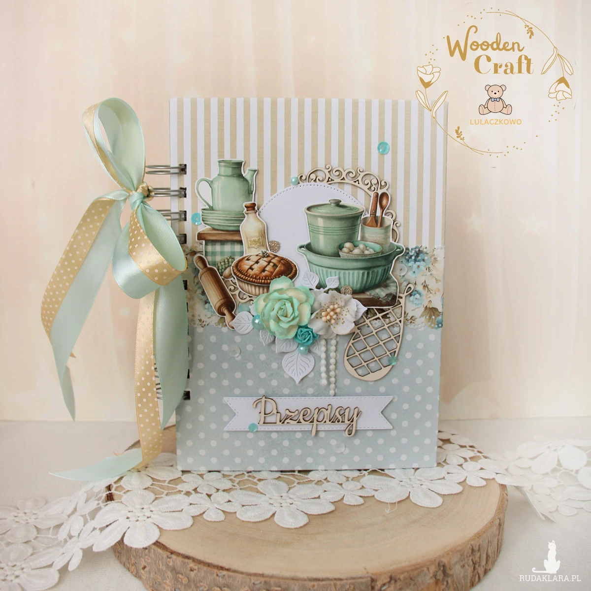 Piękny, ręcznie robiony przepiśnik, notes kulinarny wykonany metodą scrapbookingu z miksu kolekcji papierów. Okładka ozdobiona wycinankami z motywami naczyń kuchennych, ciasta wałka do ciasta, a także tekturką rękawicy kucharskiej. Na przodzie tekturkowy napis "Przepisy" - do napisu mogę dodać również imię. Przepiśnik ozdobiony miętowo-beżową kokardą.