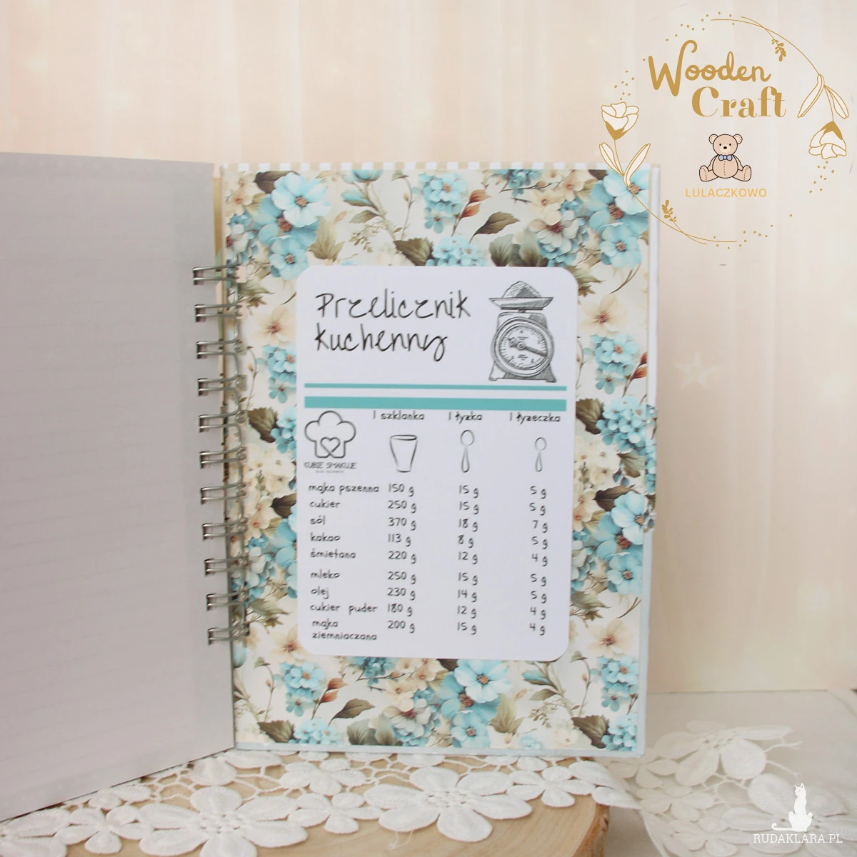 W środku znajduje się 80 kartek na przepisy, na przedniej okładce kieszonka oraz dwie maty na zapiski lub zdjęcia, na tylnej okładce przelicznik kuchenny.
