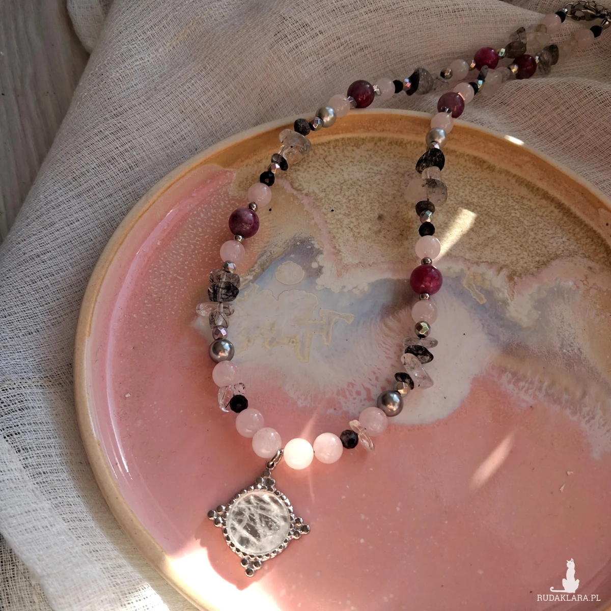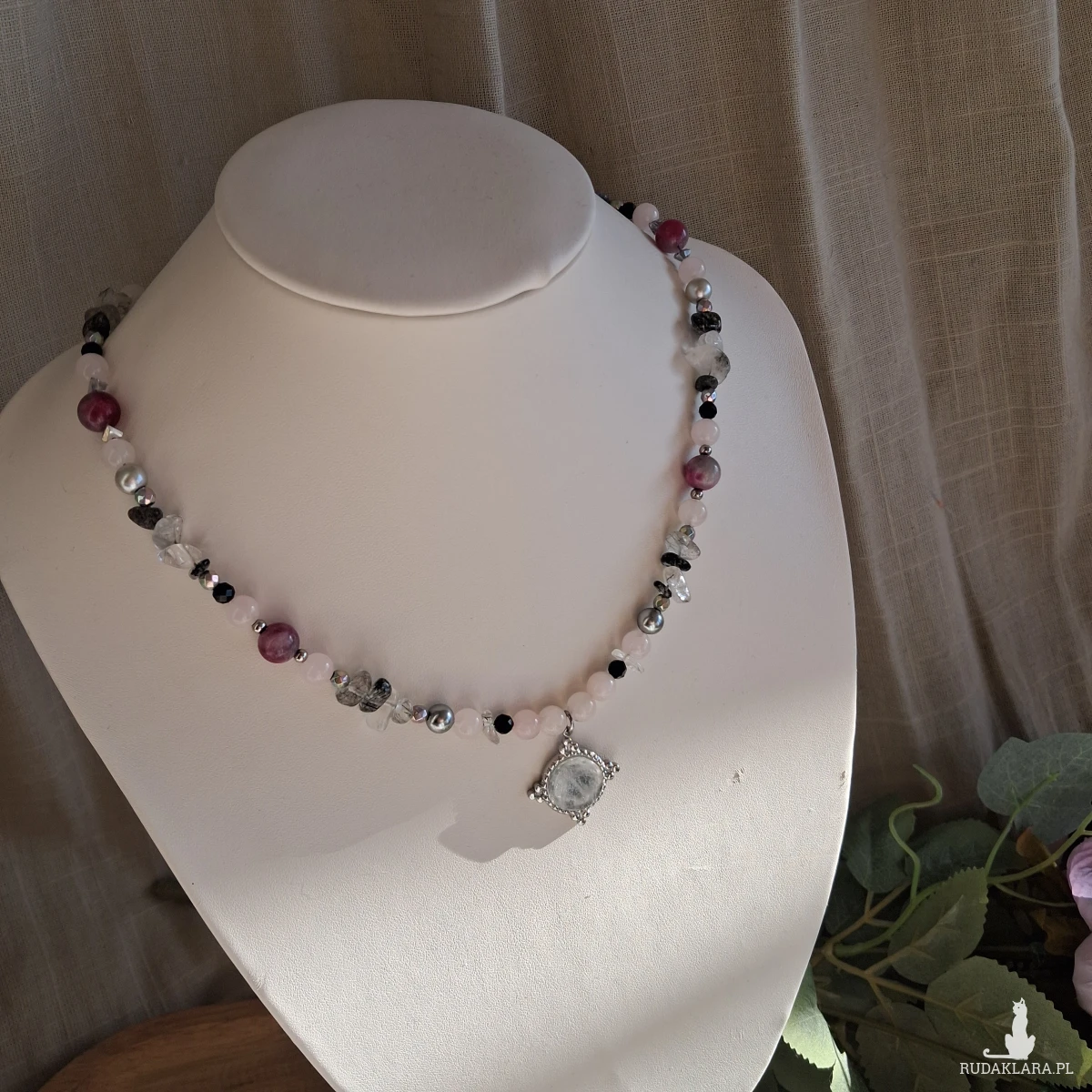 Naszyjnik ręcznie tworzony z kamieni i stali nierdzewnej (jubilerskiej). Użyte kamienie: