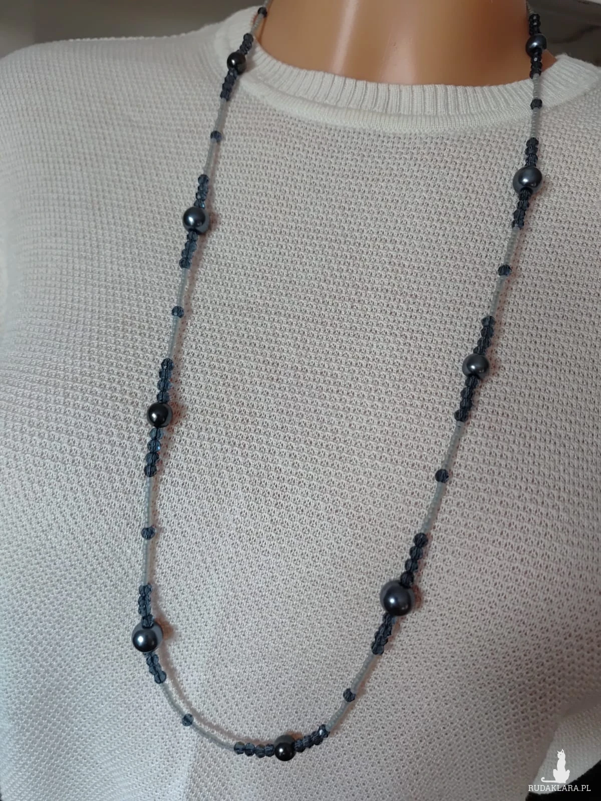 Długi sznur korali perłowych i kryształków szklanych. Perła grafit 6 i 10 mm, Sznur korali na sznurku syntetycznym. Wygodne zakładanie dla osób starszych przez głowę bez zapięcia. Długość sznura 40 cm