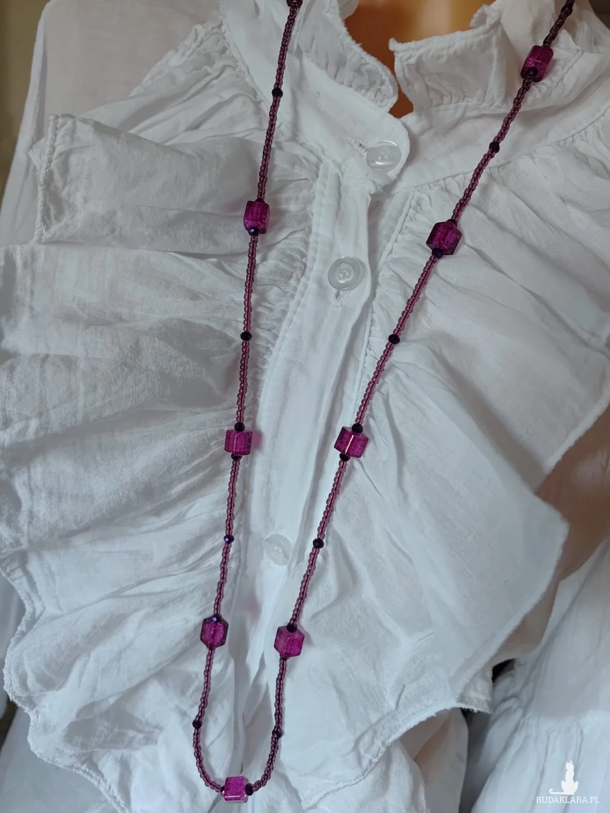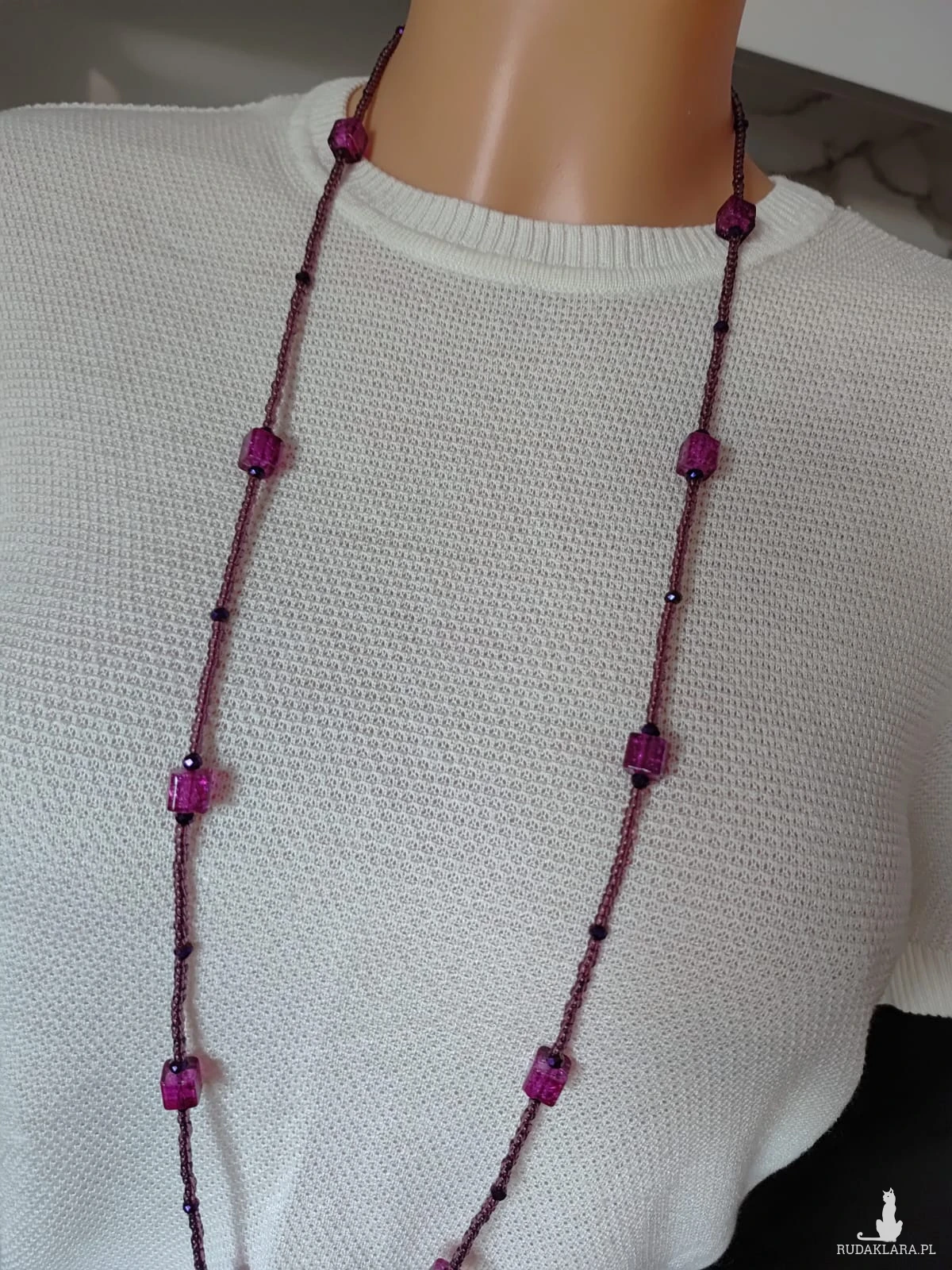 Długi sznur koralików w kolorze fioletowym w połączeniu z kostkami szkła weneckiego 8 mm, sznur korali na sznurku syntetycznym, dlugość sznura 47 cm, bez zapięcia co ułatwia zakładanie korali starszej osobie.