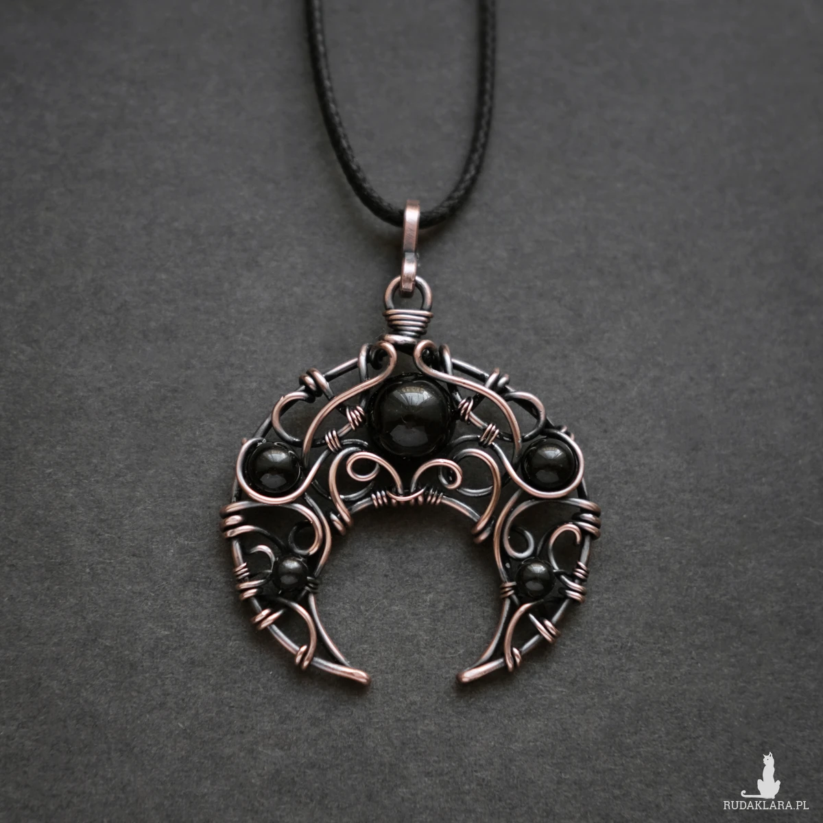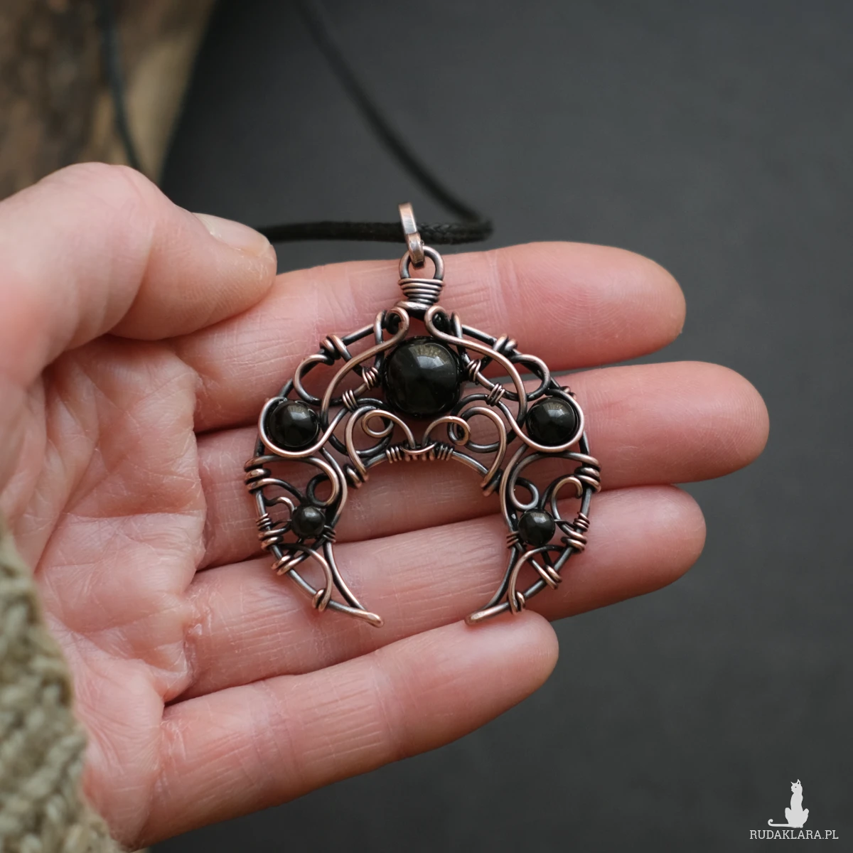 Miedziany wisior - księżyc z kamieniami czarnego turmalinu. Piękne fantazyjne sploty dodają mu baśniowego charakteru.