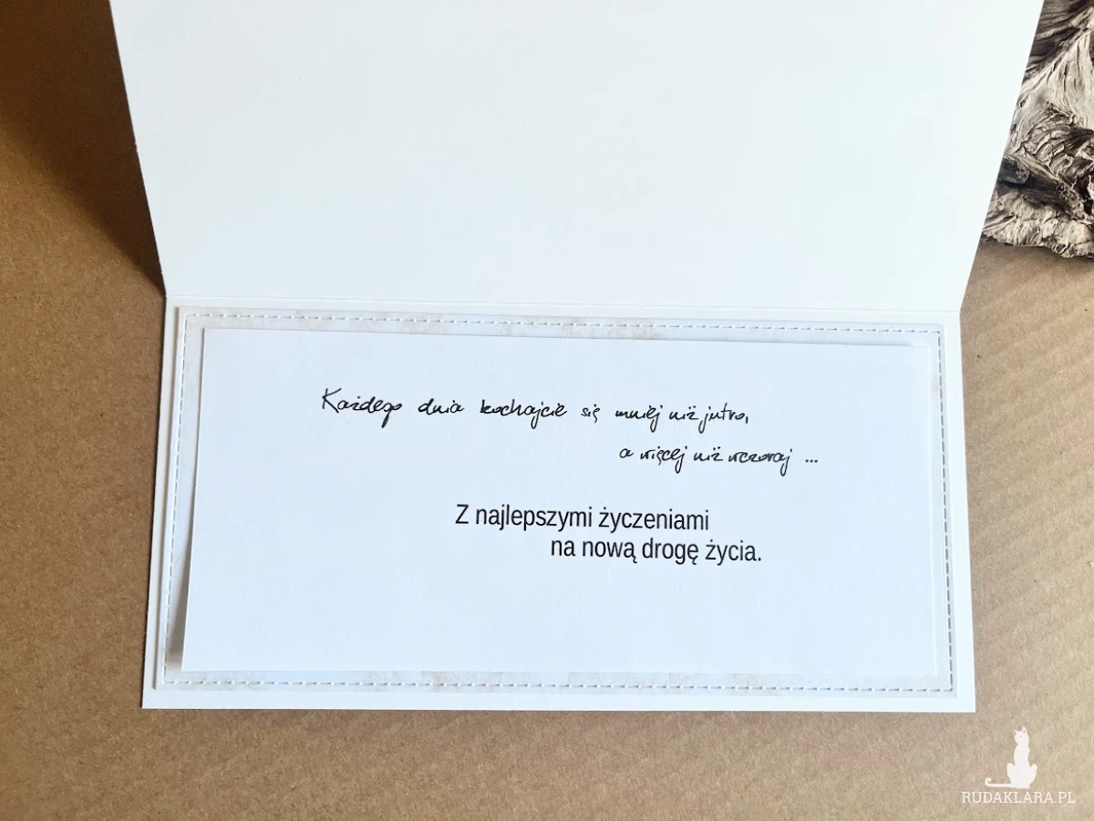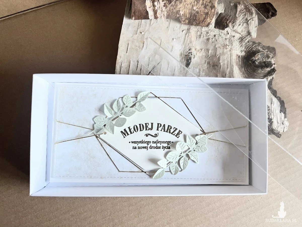 Elegancka, bogato zdobiona kartka w pudełku z okazji ślubu. Utrzymana w delikatnej kolorystyce bieli i złota .ozdobiona delikatnymi liśćmi eukaliptusa.. Kartka jest w całości wykonana ręcznie z najlepszej jakości materiałów do scrapbookingu. Wielkość pudełka z okienkiem 22x11x3,5 Wielkość kartki 21×10 z gotowymi życzeniami do własnoręcznego podpisu.Na dnie pudełka umieszczono kieszonkę na małe co nieco.Do kompletu dodano białą torebkę która jest ozdobiona w tej samej stylizacji co kartka. Wielkość torebki 31x24x10cm.W tej postaci komplet dostępny od ręki.