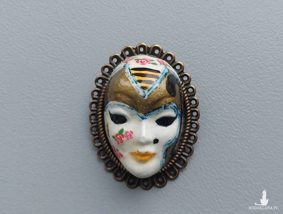 robiony odlew twarzy, malowany na wzór maski weneckiej - to oryginalna broszka,