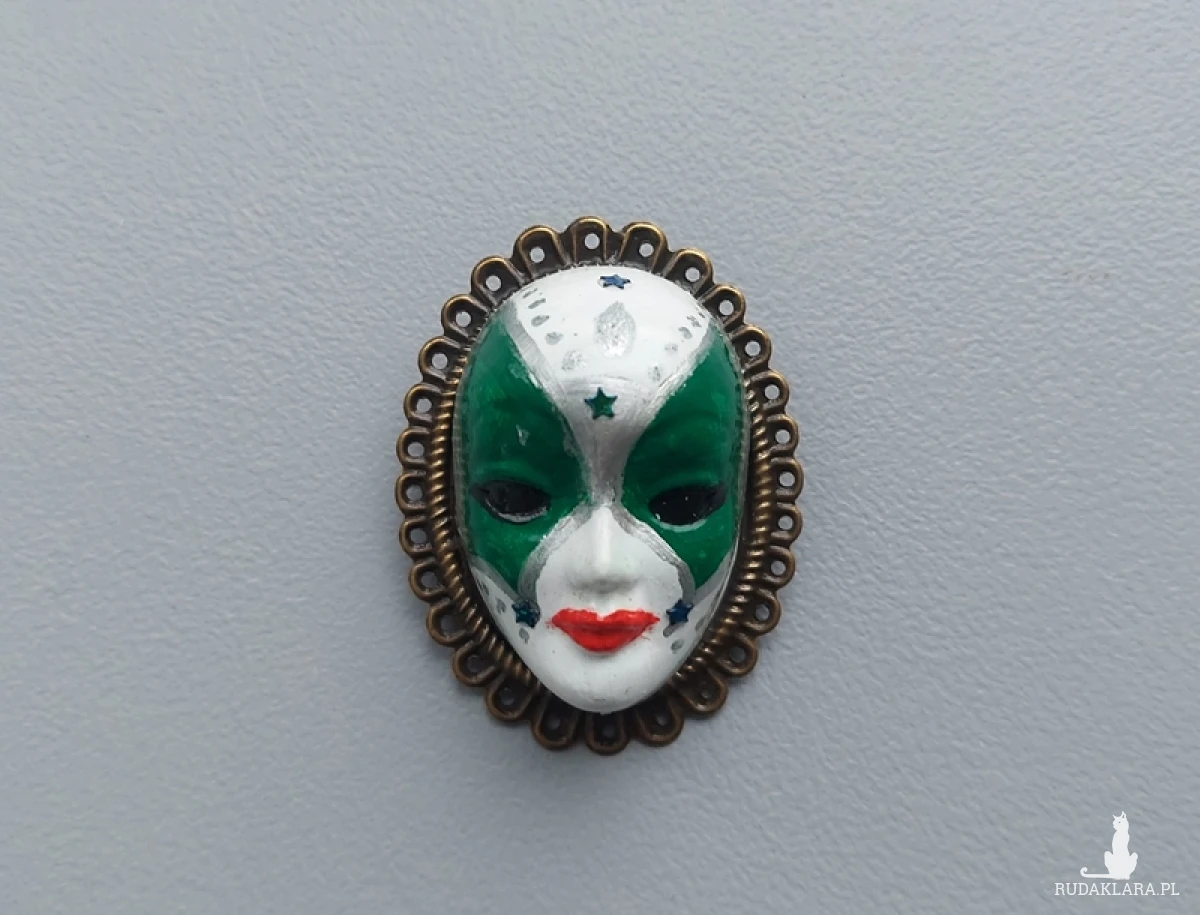 robiony odlew twarzy, malowany na wzór maski weneckiej - to oryginalna broszka,