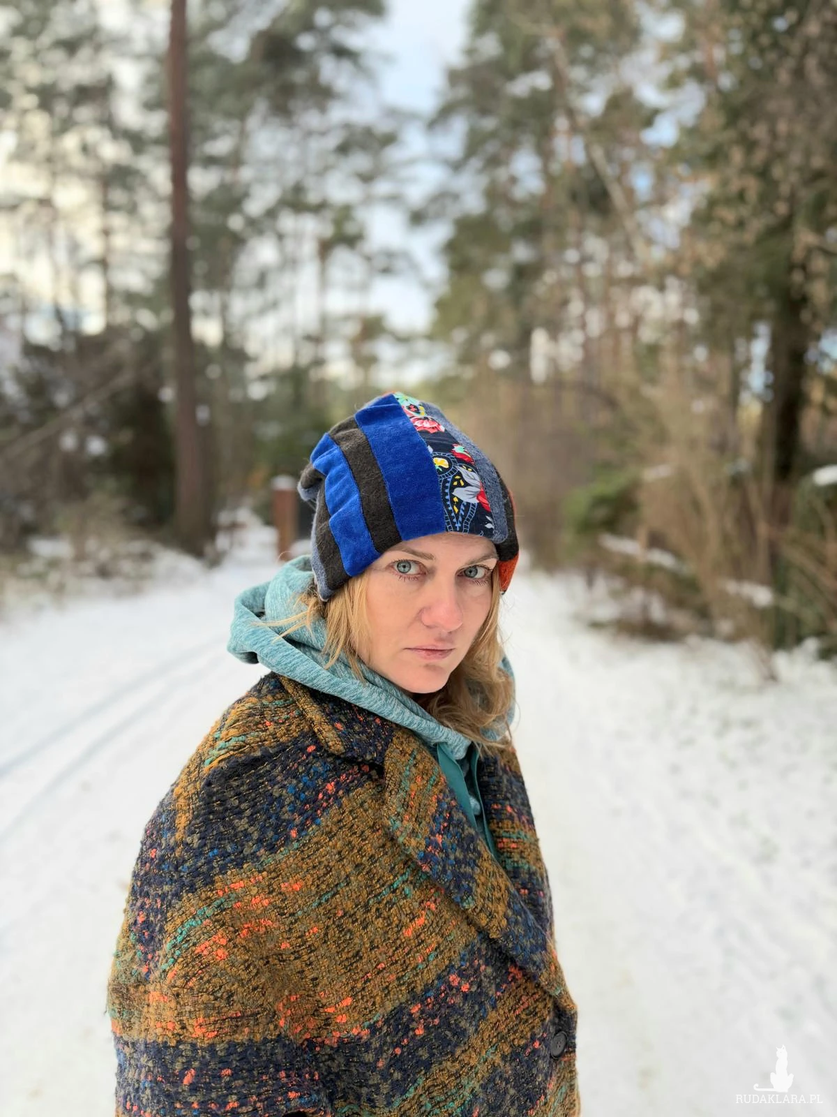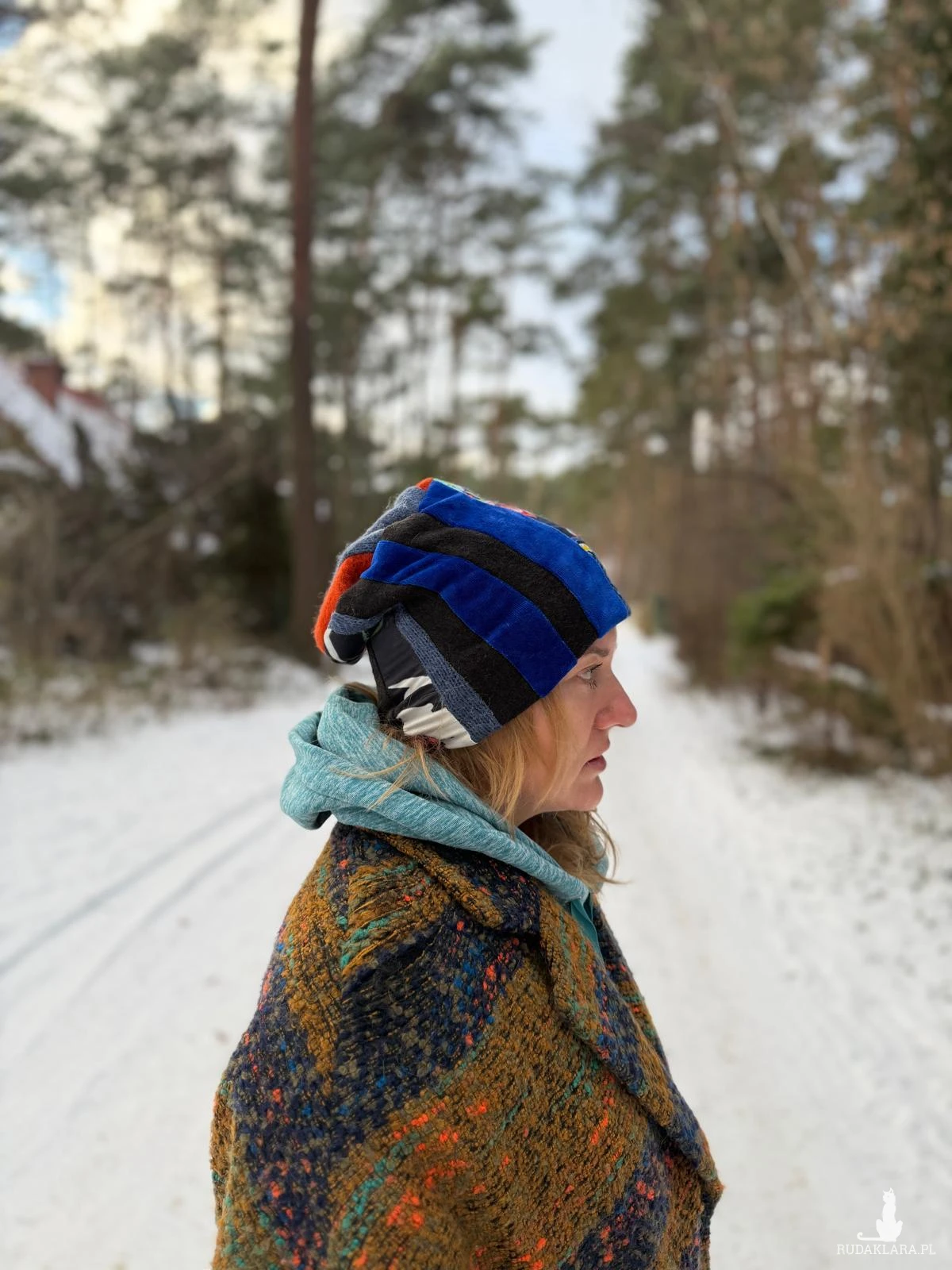 Czapka damska Smerfetka patchworkowa, na podszewce dobra na codzienne noszenie, wykonana w pojedynczym egzemplarzu rękodzieło polecam boks d1