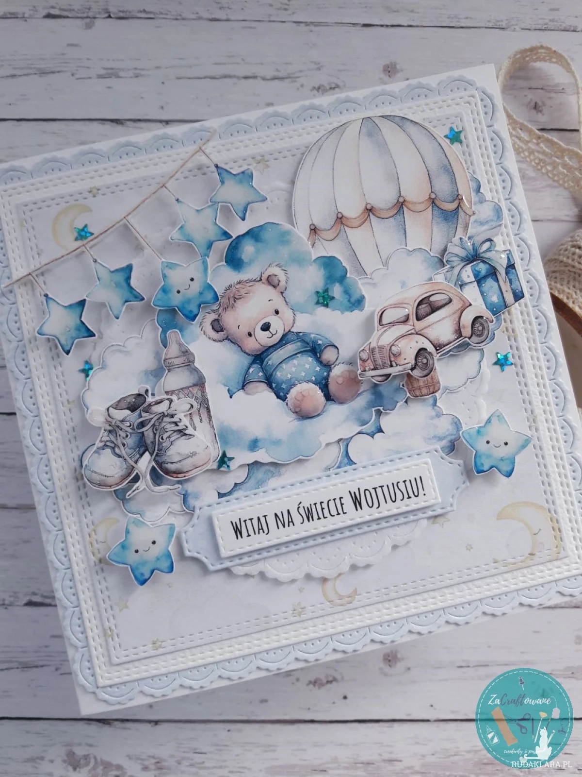 Kartka z okazji narodzin chłopczyka, której motywem przewodnim jest uroczy misiu leżący na chmurce w otoczeniu wesołych gwiazdek, zabawek i innych elementów.