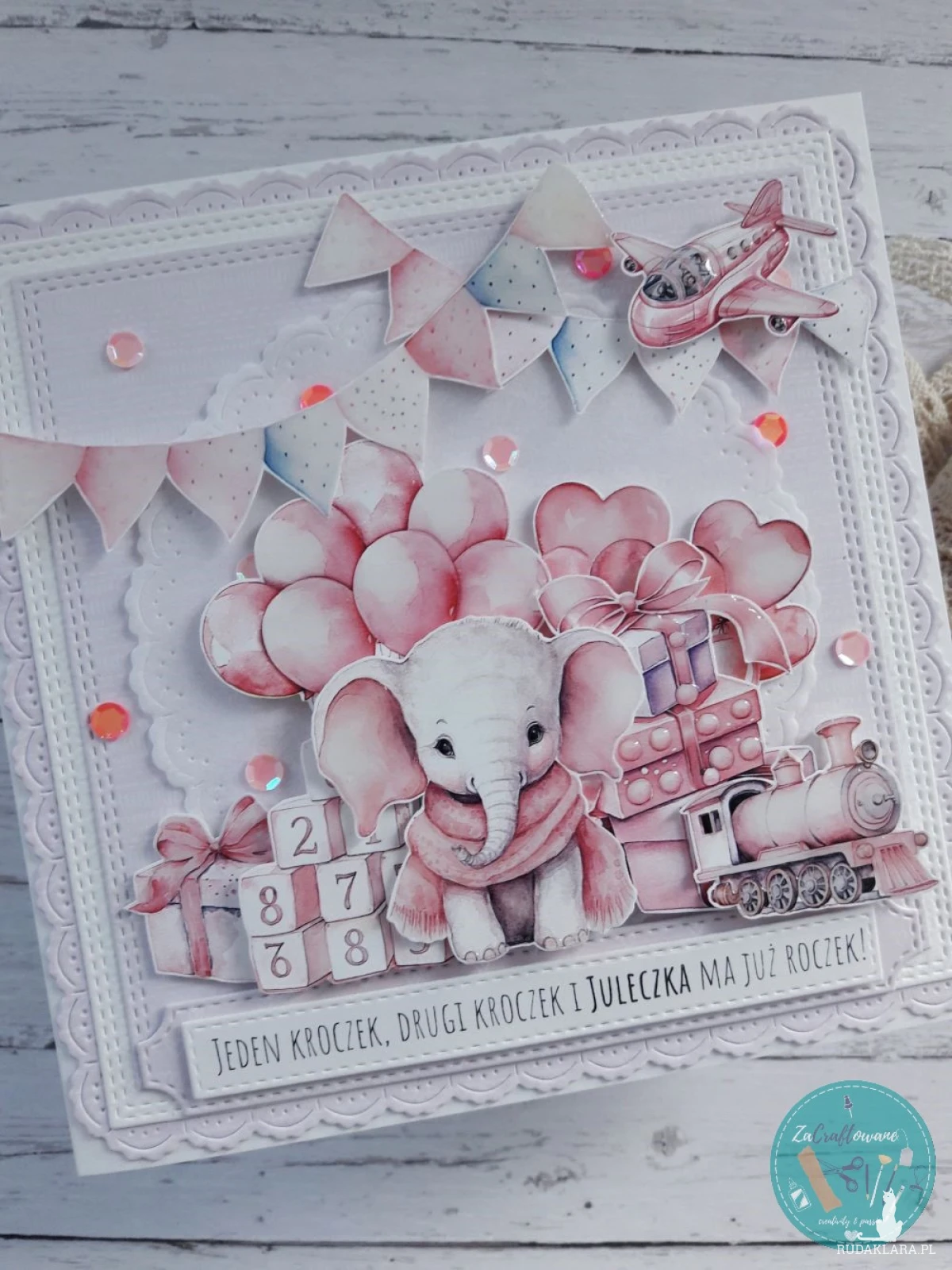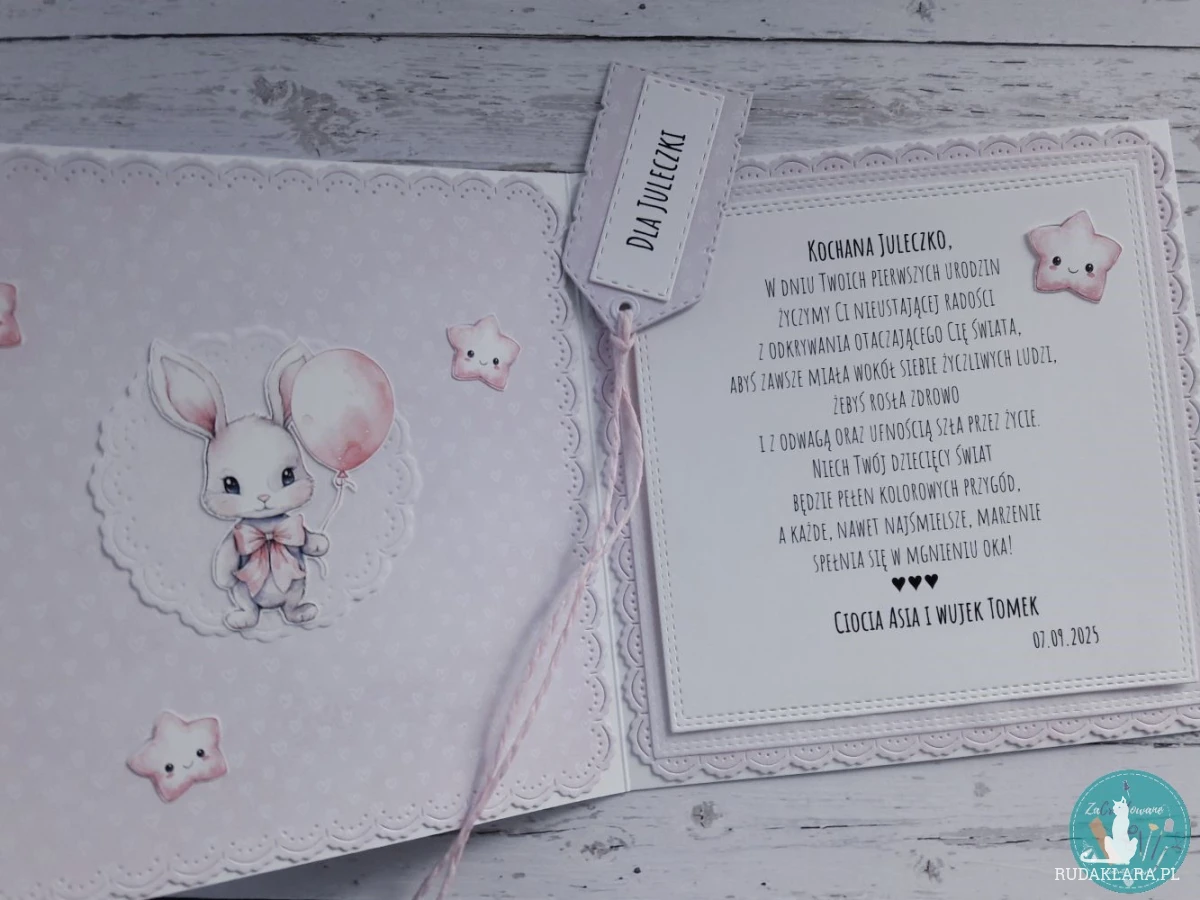 PERSONALIZACJA jest wliczona w cenę kartki. W jej zakres wchodzi umieszczenie dowolnego napisu na banerku z przodu np. „Jeden kroczek, drugi kroczek i [Juleczka] ma już roczek!” oraz umieszczenie życzeń wraz z podpisem i datą wewnątrz kartki.