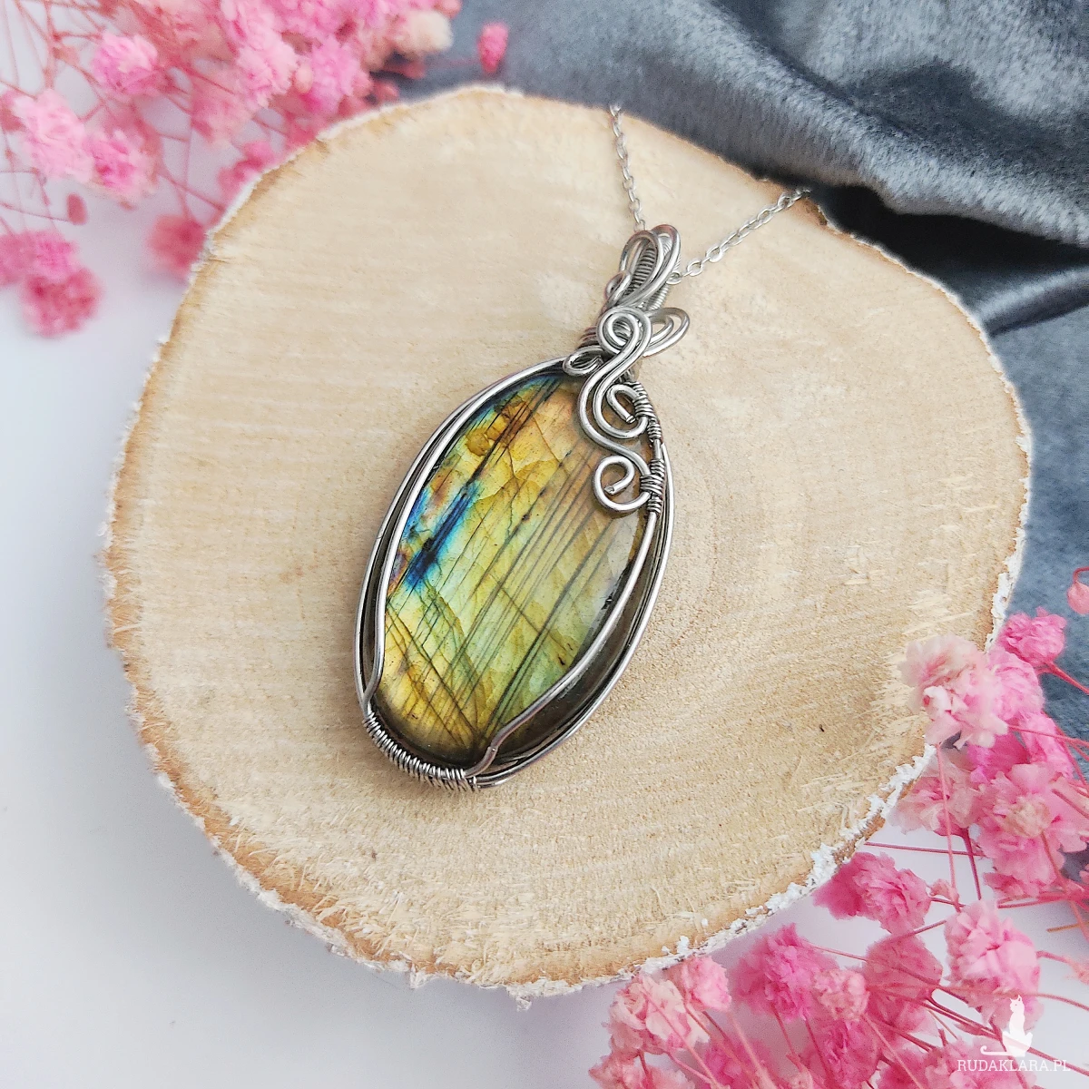 Naszyjnik Labradoryt ręcznie robiony. Wykonany techniką wire wrapping z drutów ze stali chirurgicznej.
