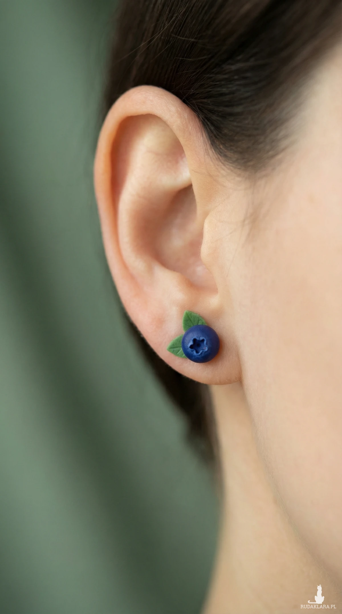 Urocze drobne kolczyki z owocem jagody, wykonane ręcznie z profesjonalnej masy termoutwardzalnej