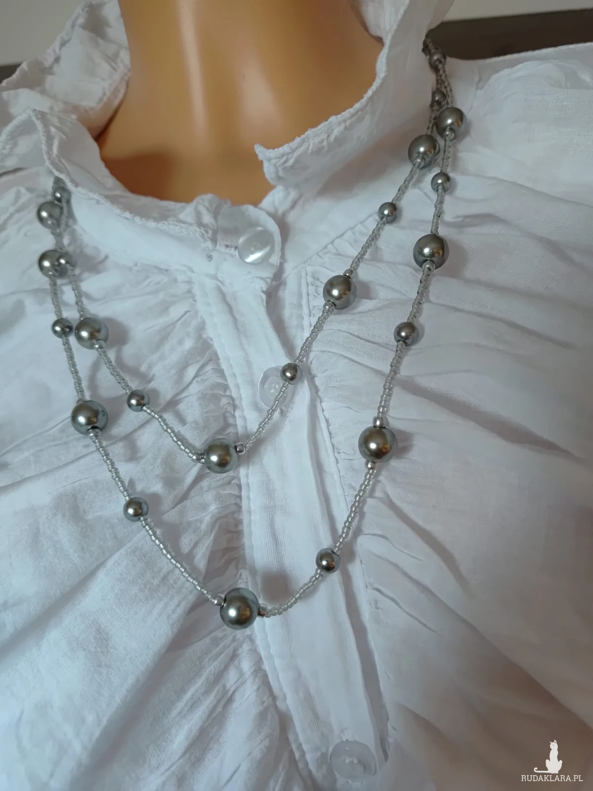 Długi sznur korali perłowych i drobnych koralików japońskich w szarym kolorze. Perła szara 6 i 10 mm, Sznur korali na sznurku syntetycznym. Wygodne zakładanie dla osób starszych przez głowę bez zapięcia. Długość sznura 65 cm, można dwukrotnie owinąć wokół szyi