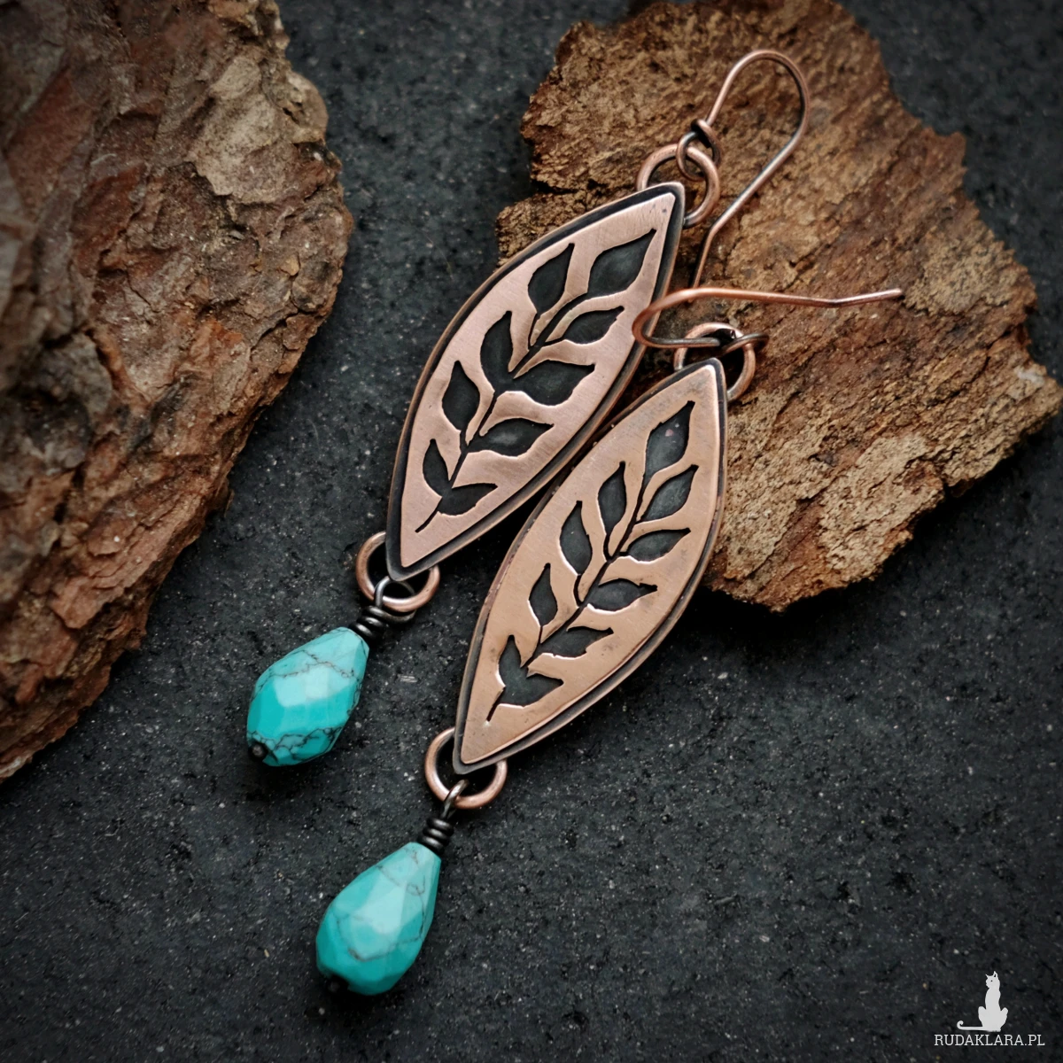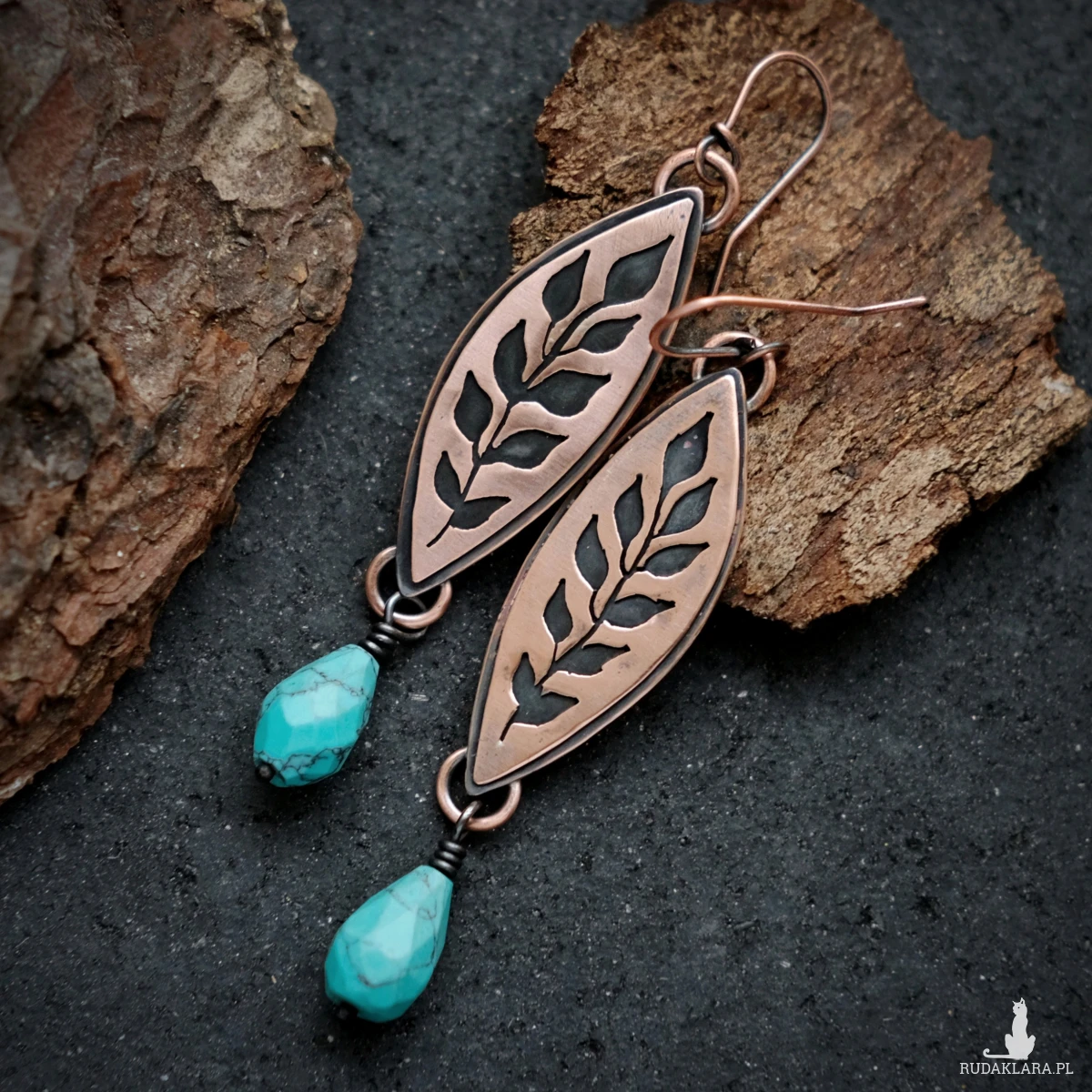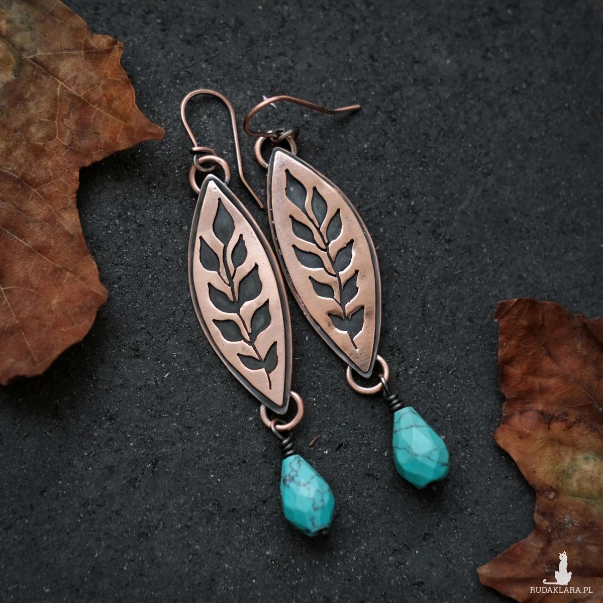 Kolczyki wykonałam ręcznie z miedzianej blachy. Miedź poddałam oksydacji w celu nadania efektu patyny i podkreślenia roślinnego motywu (czerń w zagłębieniach). Kolczyki posiadają przezroczyste zatyczki, co nie jest pokazane na zdjęciach.