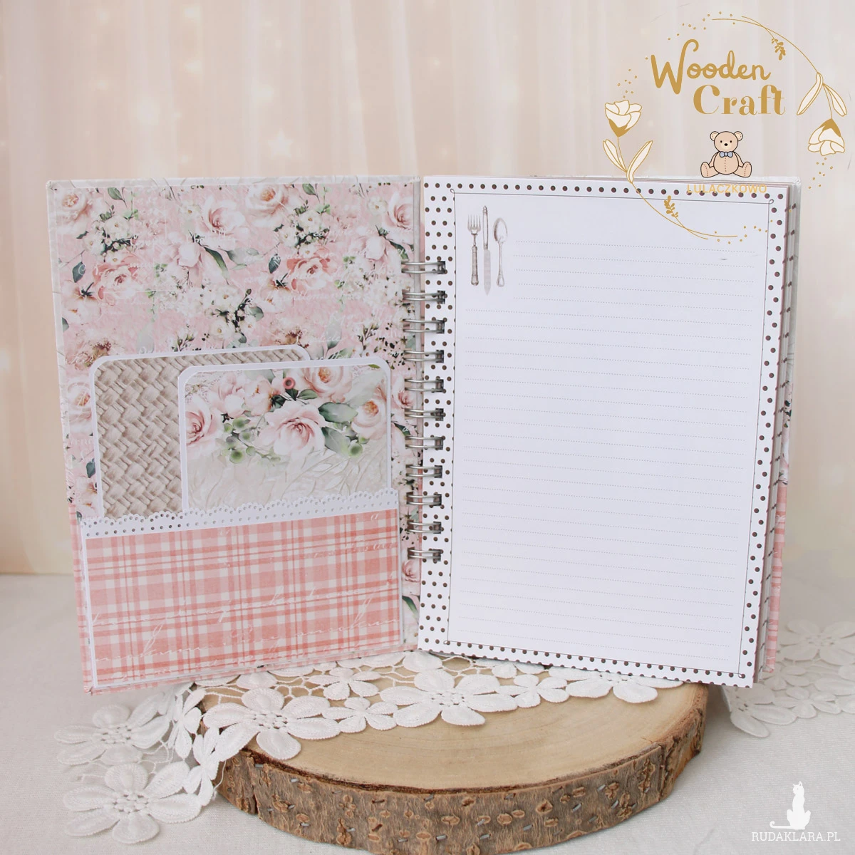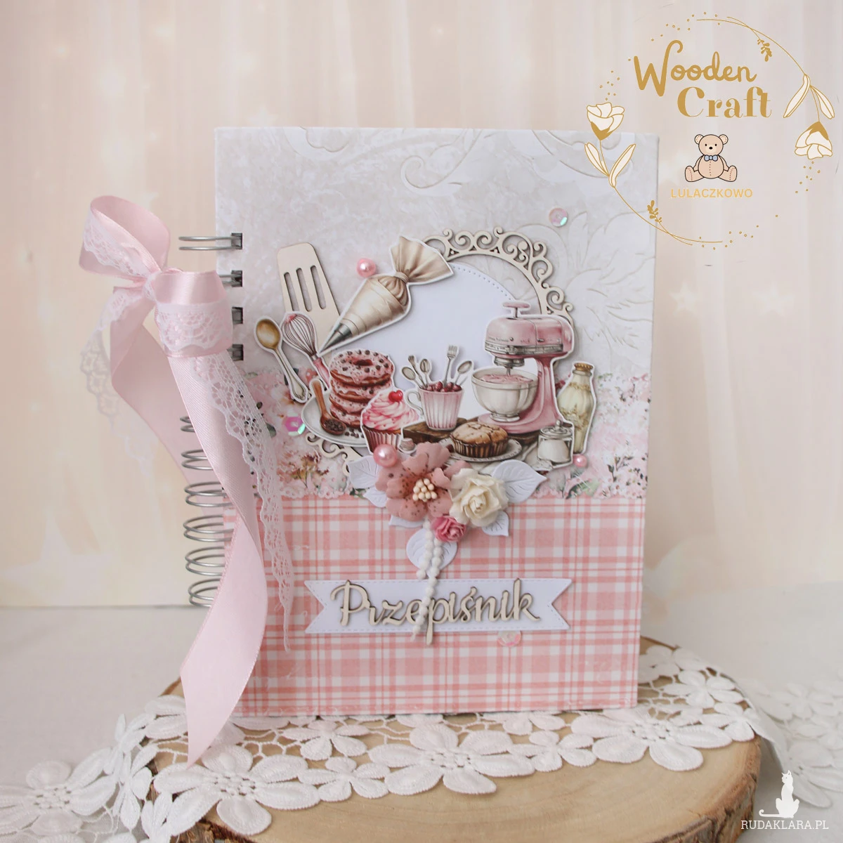 Piękny, ręcznie robiony przepiśnik, notes kulinarny wykonany metodą scrapbookingu z miksu kolekcji papierów. Okładka ozdobiona wycinankami z motywami miksera planetarnego, donutów, babeczek i kuchennych przyborów. Udekorowana ręcznie robionymi kwiatami oraz cekinami. Na przodzie tekturkowy napis "Przepiśnik" - do napisu mogę dodać również imię. Przepiśnik ozdobiony różowo-koronkową kokardą.