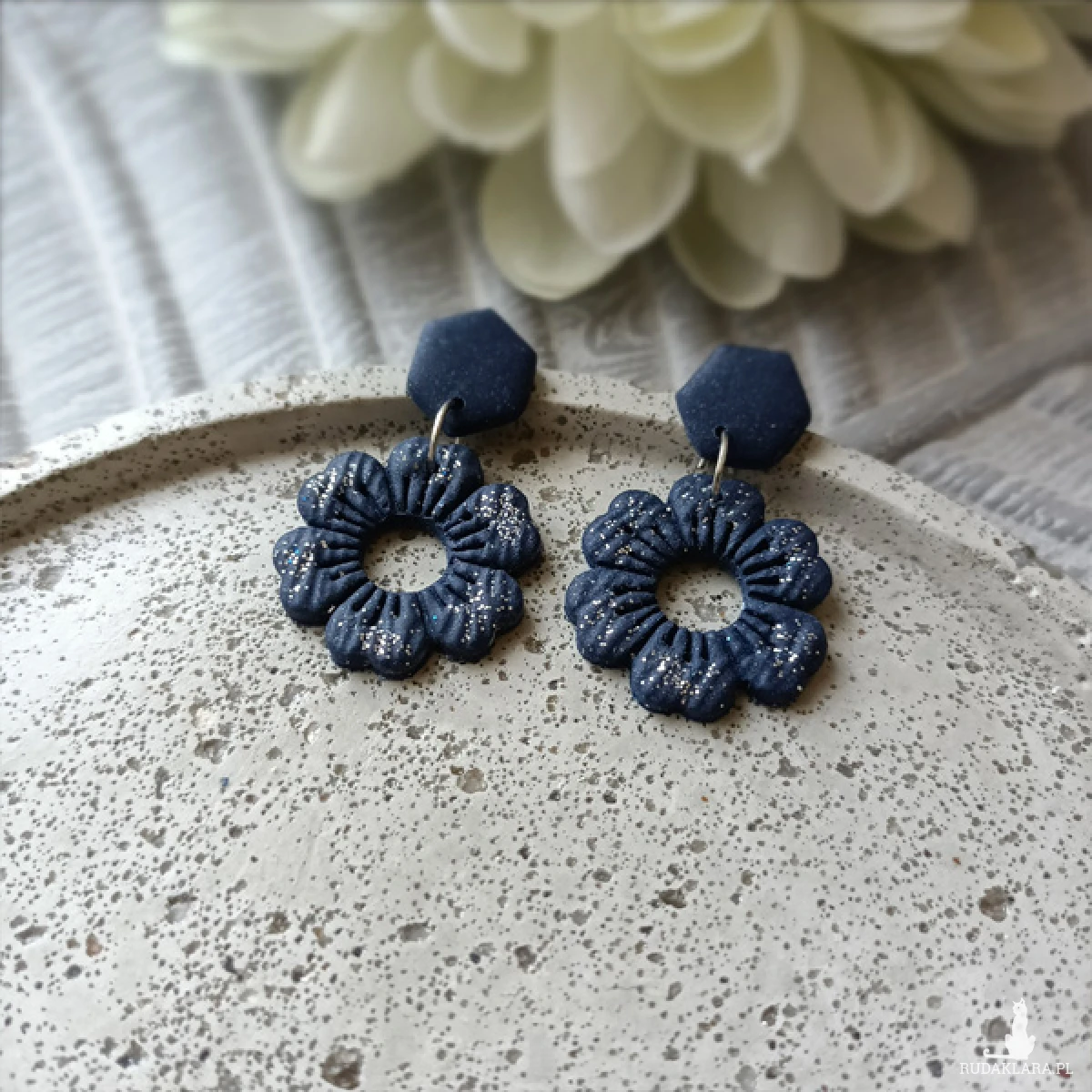 Kolczyki zostały wykonane w całości ręcznie z wysokiej jakości glinki polimerowej. Jest to materiał bardzo trwały, lekki i odporny na wszelkiego rodzaju czynniki zewnętrzne. Kolczyki są w kolorze granatowym z drobinkami brokatu, zawieszone na sztyftach. Elementy metalowe są ze stali chirurgicznej. Całkowita długość kolczyków 3,8 cm, szerokość 2,5 cm. Są bardzo lekkie i pasują do każdej stylizacji na każdą porę dnia. Biżuteria pakowana jest w ozdobne pudełko.