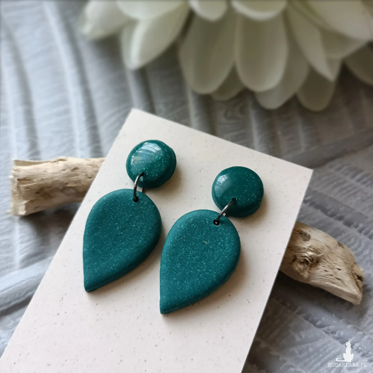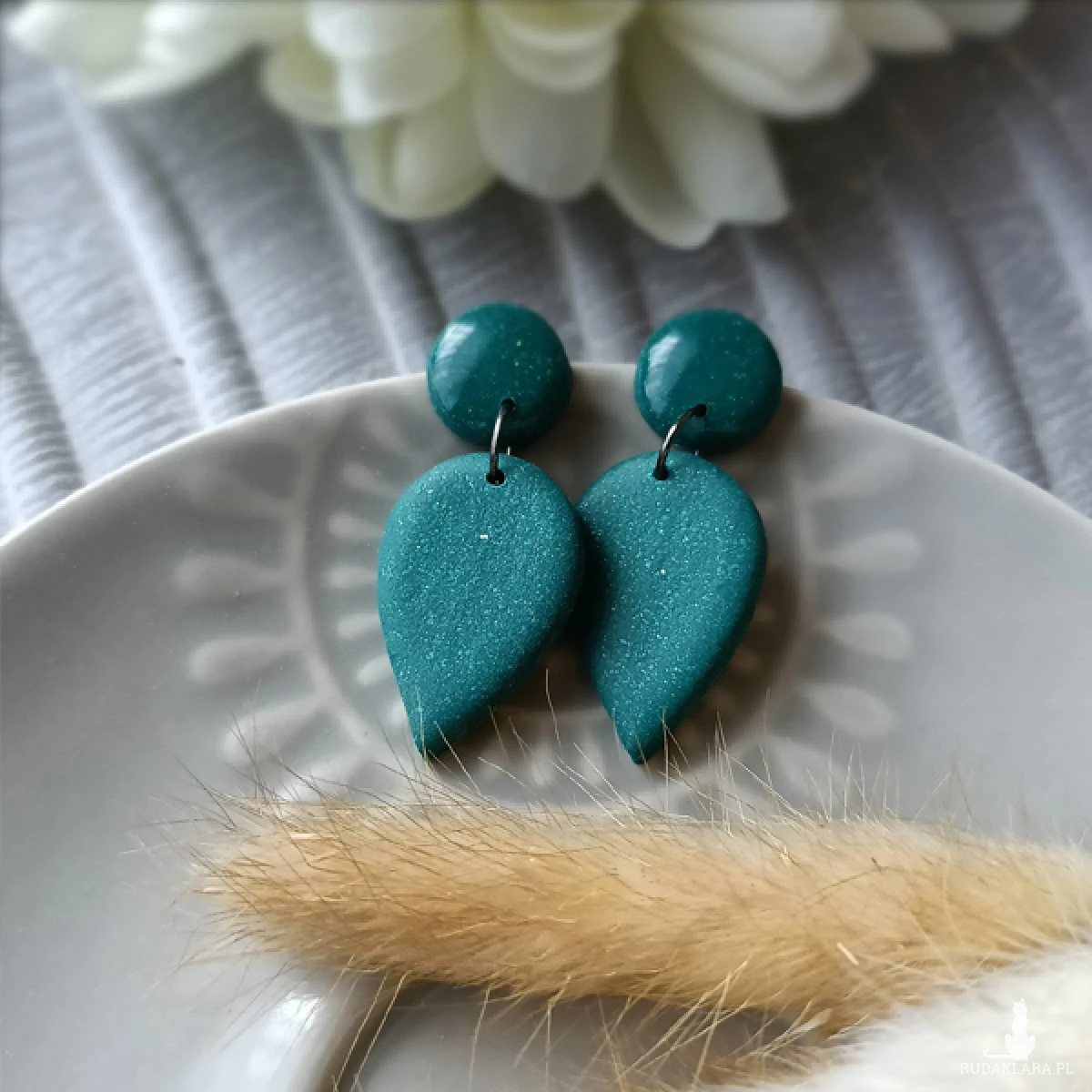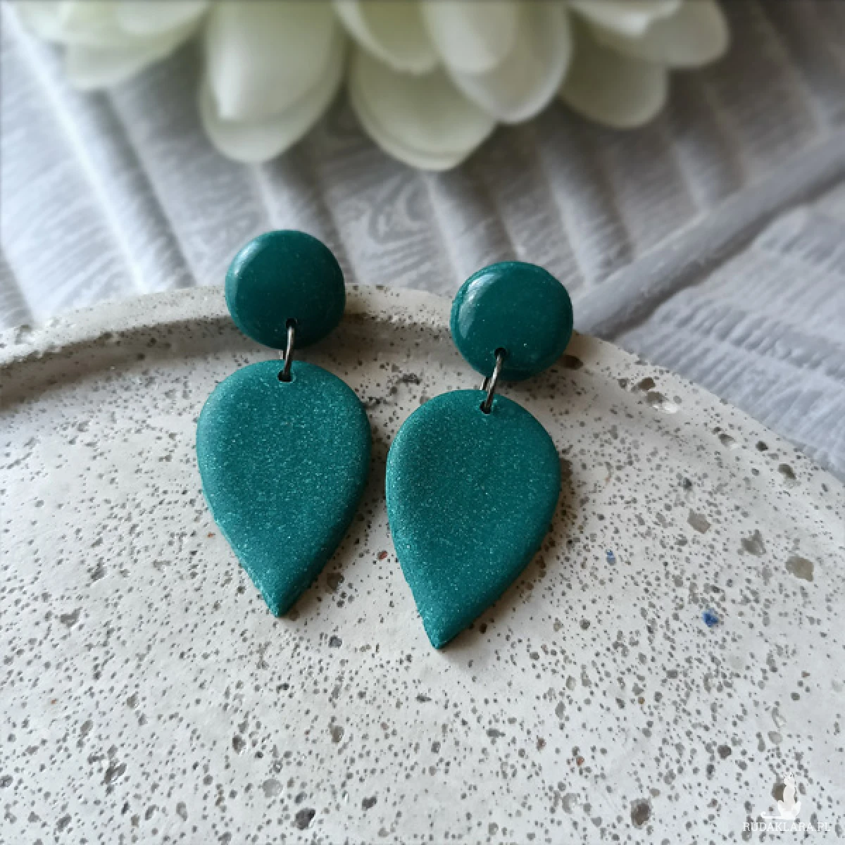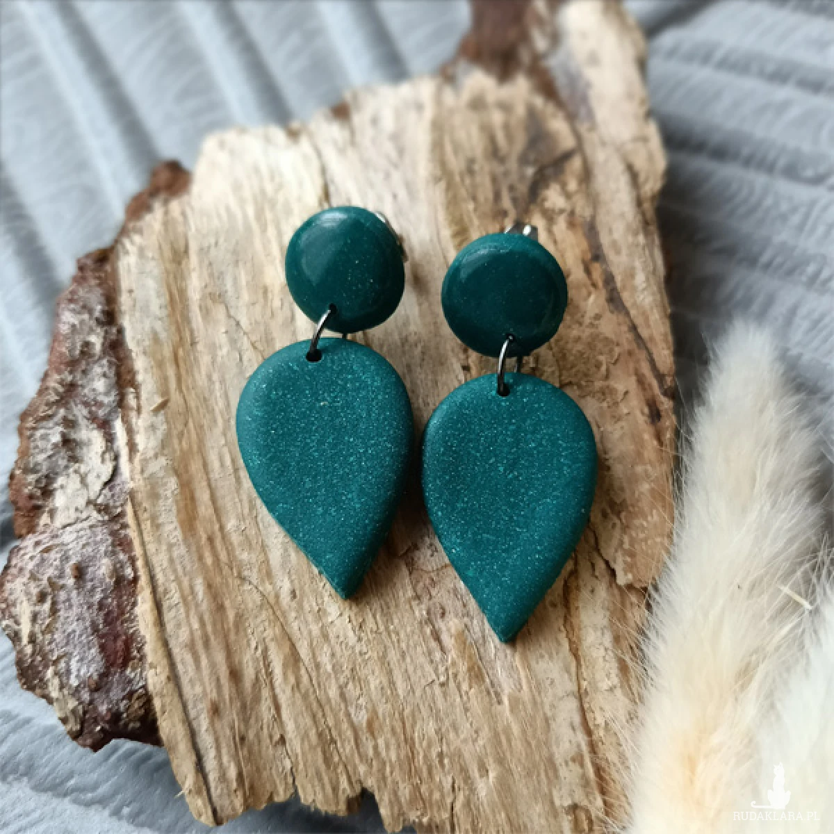 Kolczyki zostały wykonane w całości ręcznie z wysokiej jakości glinki polimerowej. Jest to materiał bardzo trwały, lekki i odporny na wszelkiego rodzaju czynniki zewnętrzne. Kolczyki są w kolorze butelkowej zieleni z drobinkami brokatu. Zawieszone na sztyftach. Górna część kolczyków została pokryta żywicą epoksydową dla nadania błyszczącego efektu, dolna część jest matowa. Elementy metalowe są ze stali chirurgicznej. Całkowita długość kolczyków 4,3 cm, szerokość 1,8 cm. Są bardzo lekkie i pasują do każdej stylizacji na każdą porę dnia. Biżuteria pakowana jest w ozdobne pudełko.