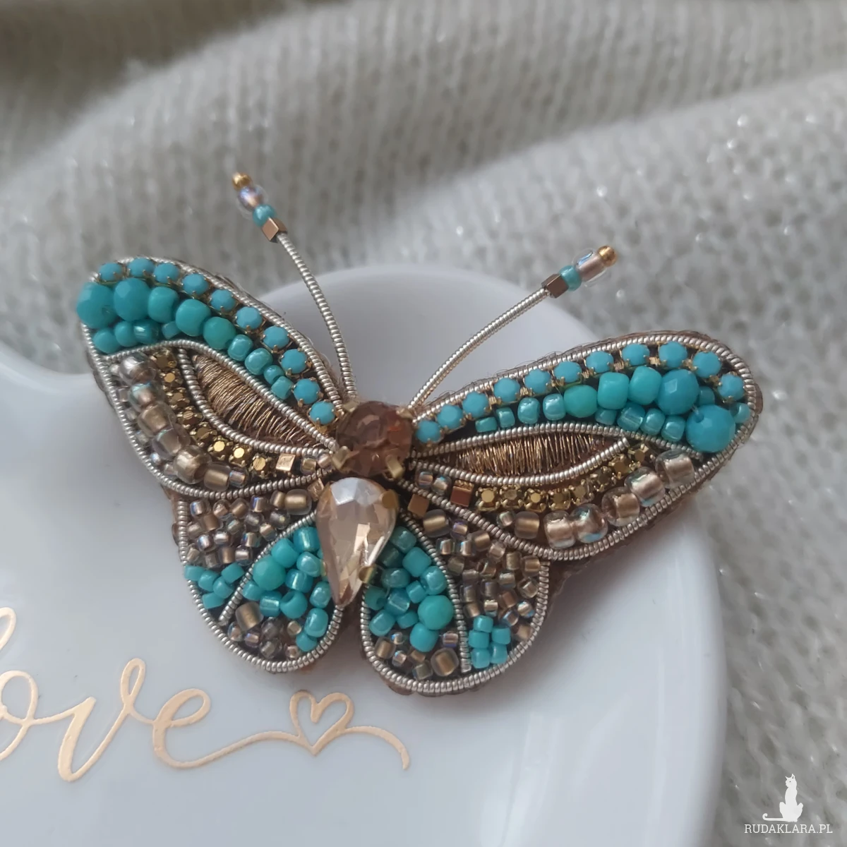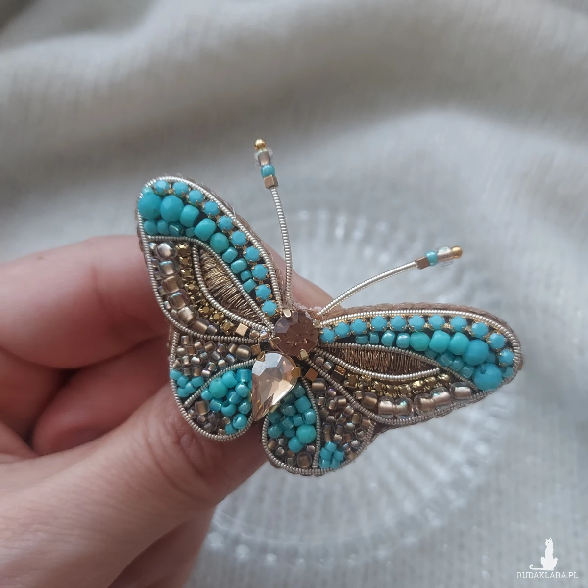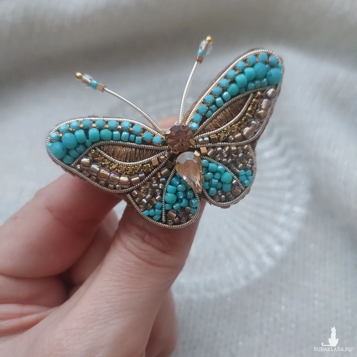 Broszka MOTYL w kolorze turkusu oraz złota powstała techniką haftu koralikowego oraz płaskiego. Przyciągnie niejedno spojrzenie. Zachwycaj nietuzinkowymi dodatkami biżuteryjnymi.