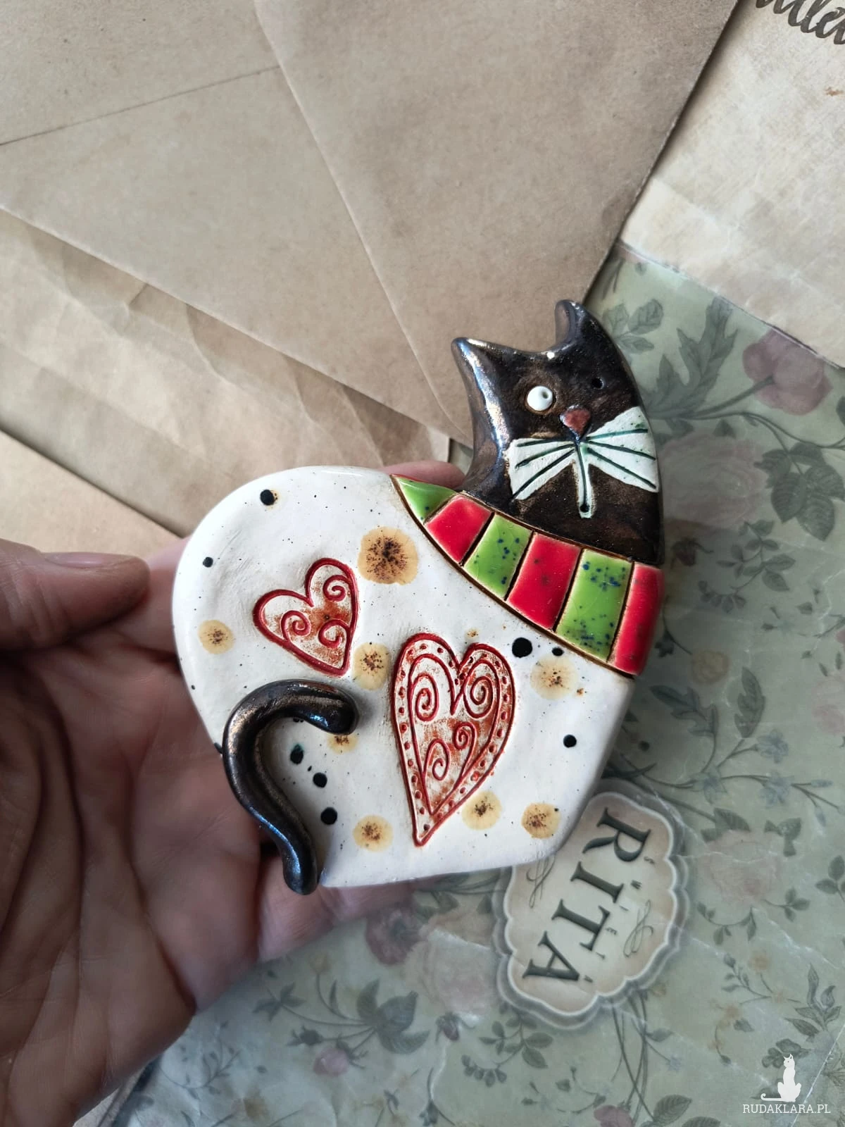 Figurka kota do postawienia o wymiarach ok 6,5 cm x 8 cm wykonana z ceramiki. Układ plam może nieznacznie różnić się od tego na zdjęciu. Polecam serdecznie.