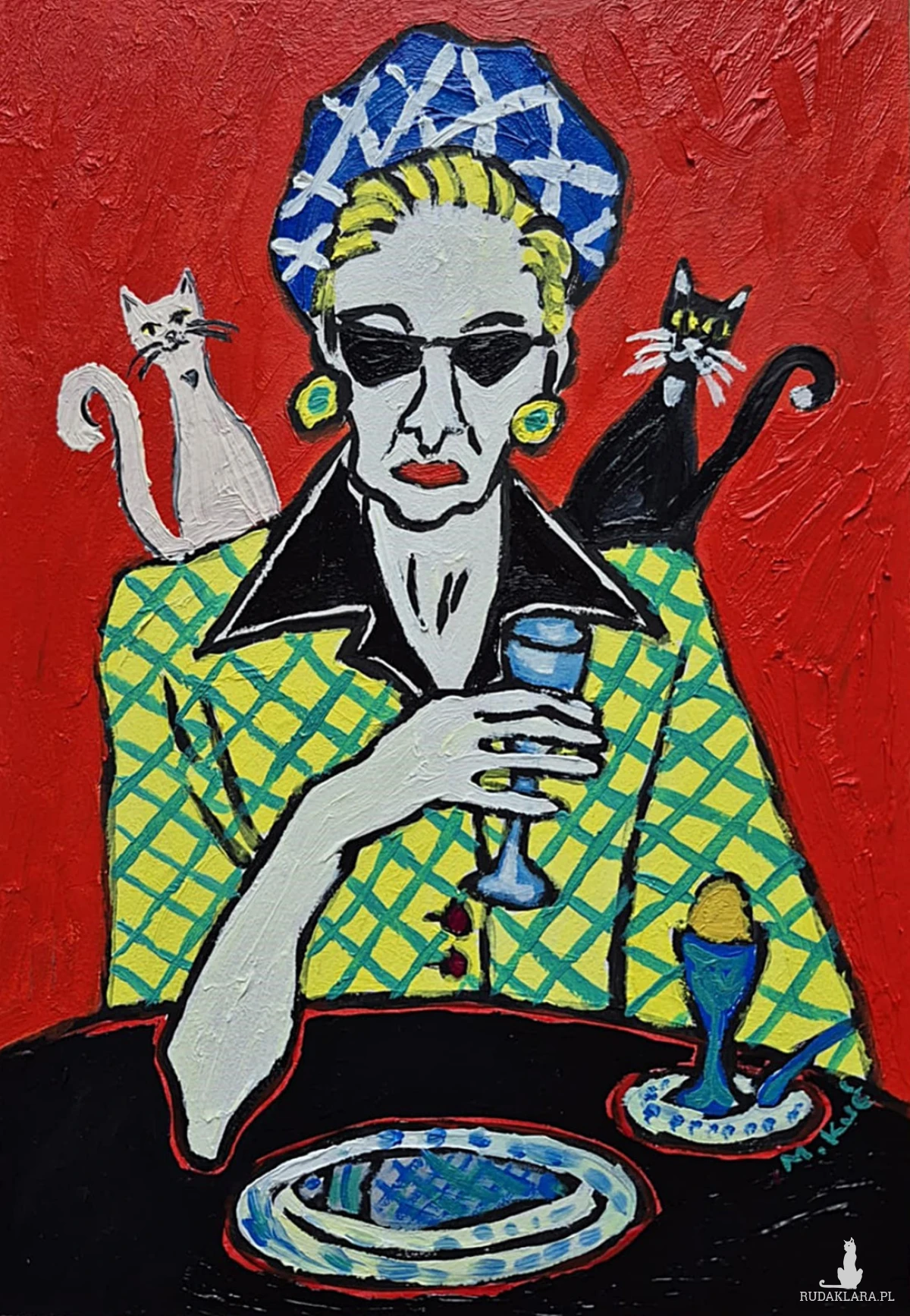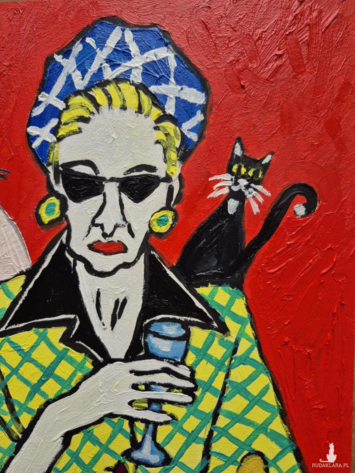To obraz o wyrazistej, niemal teatralnej sile. Na tle gęstej, chropowatej czerwieni siedzi kobieta o twarzy przypominającej maskę — surowej, nieruchomej, jakby wyrzeźbionej z kamienia. Jej spojrzenie jest ukryte za ciemnymi okularami, co odbiera jej indywidualność i czyni ją symbolem raczej niż portretem konkretnej osoby. Czerwień ust stanowi jedyny ciepły akcent na bladej twarzy, jak znak życia w chłodnej formie.