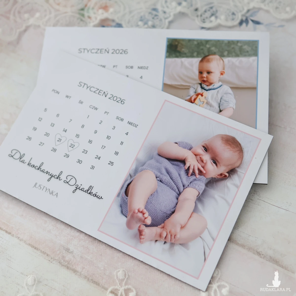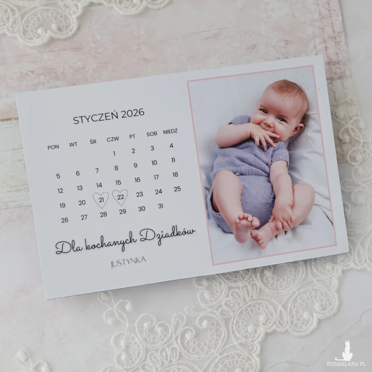 Na kartce znajduje się zdjęcie dziecka/dzieci oraz kartka z kalendarza z zaznaczoną datą Dnia Babci i Dziadka, co w prosty, ale bardzo ciepły sposób pokazuje, że ten dzień jest ważny i zapamiętany.