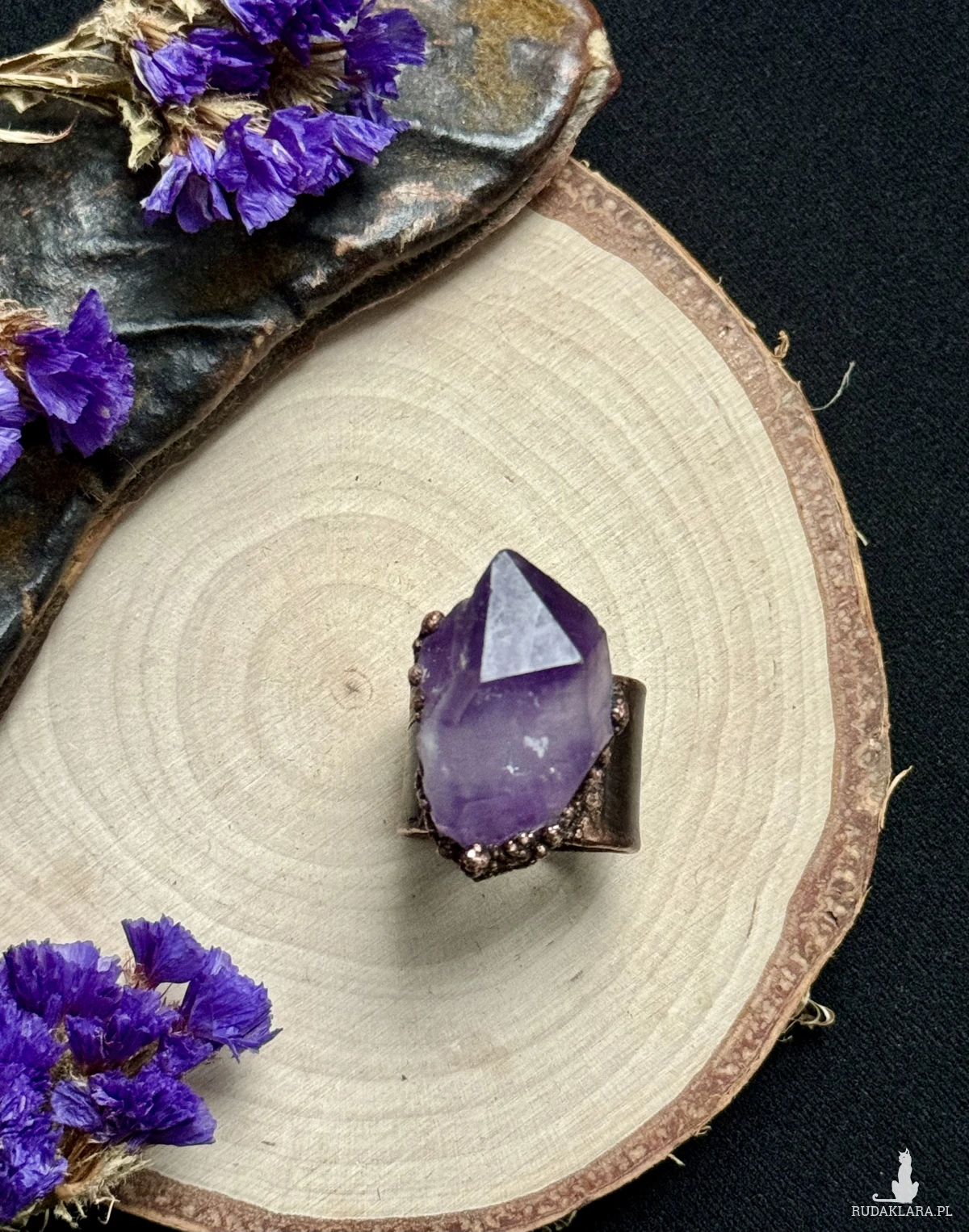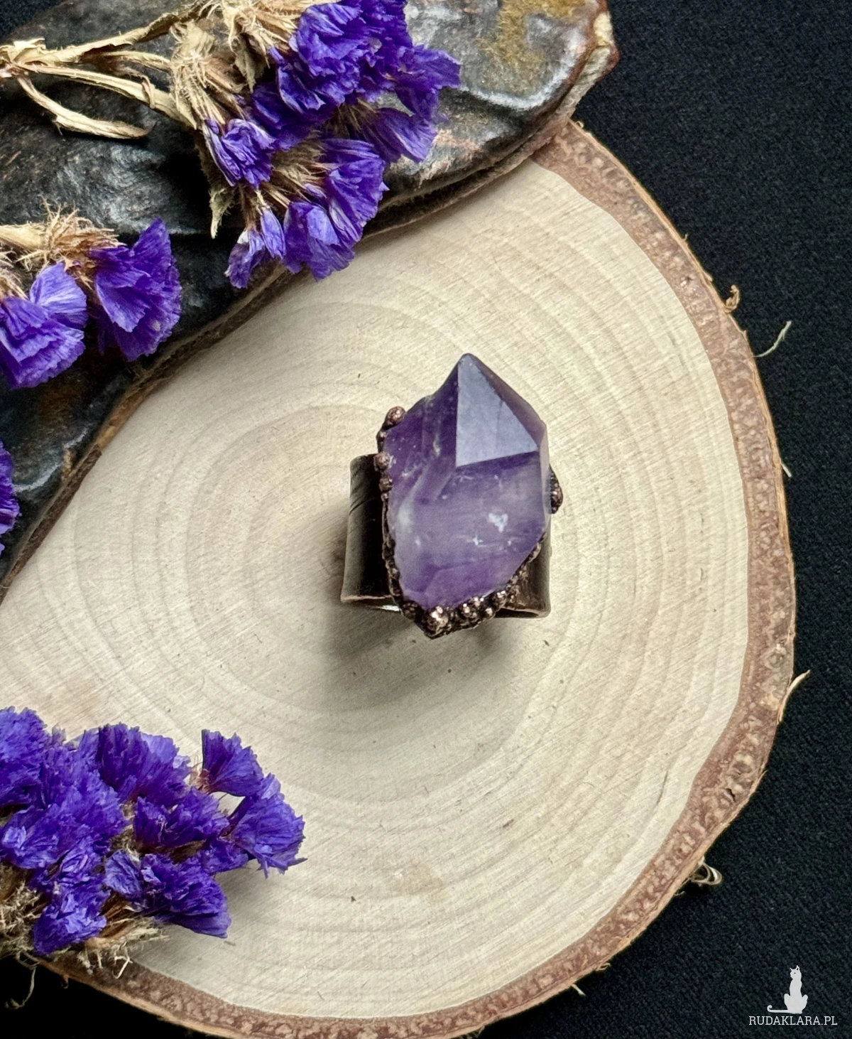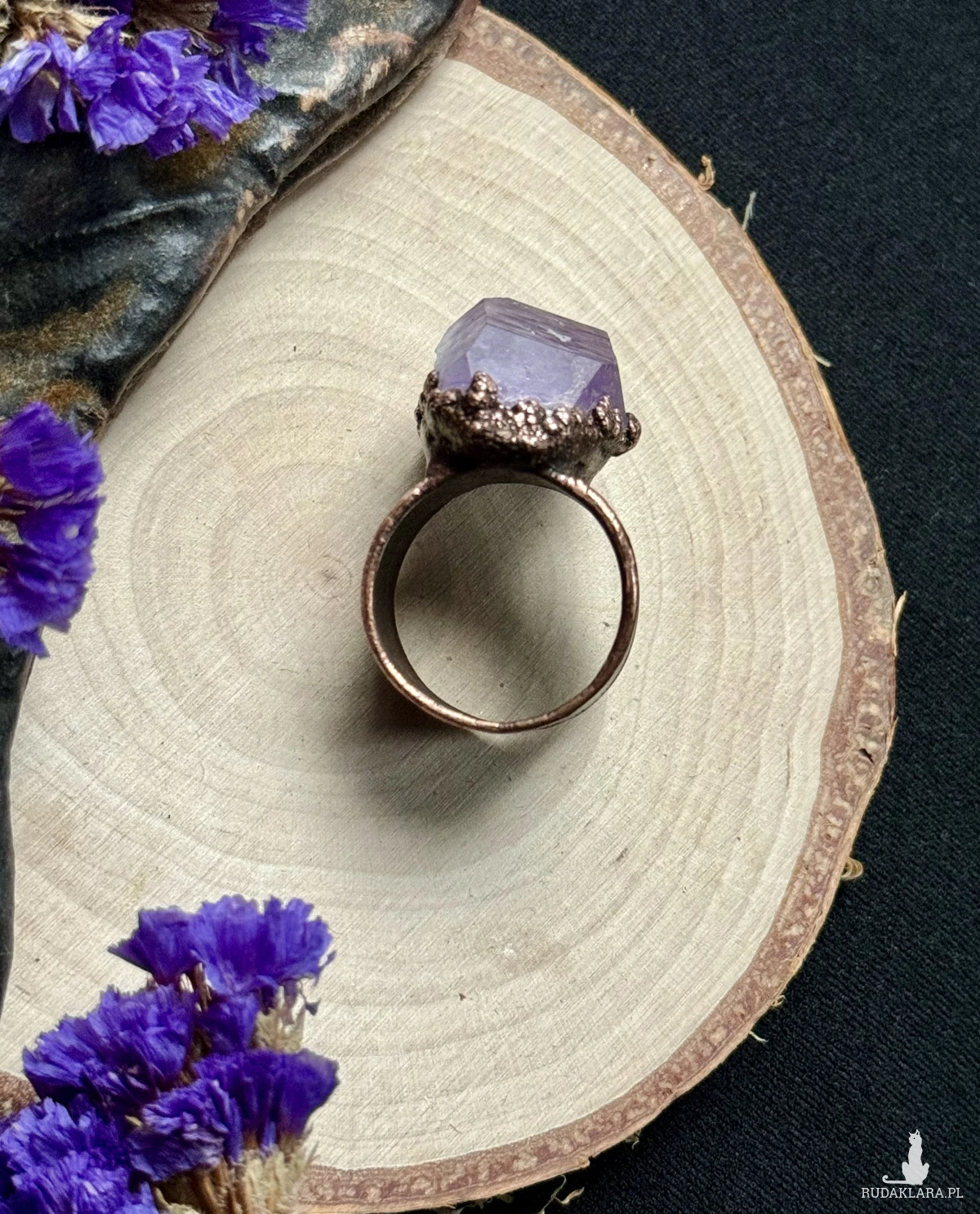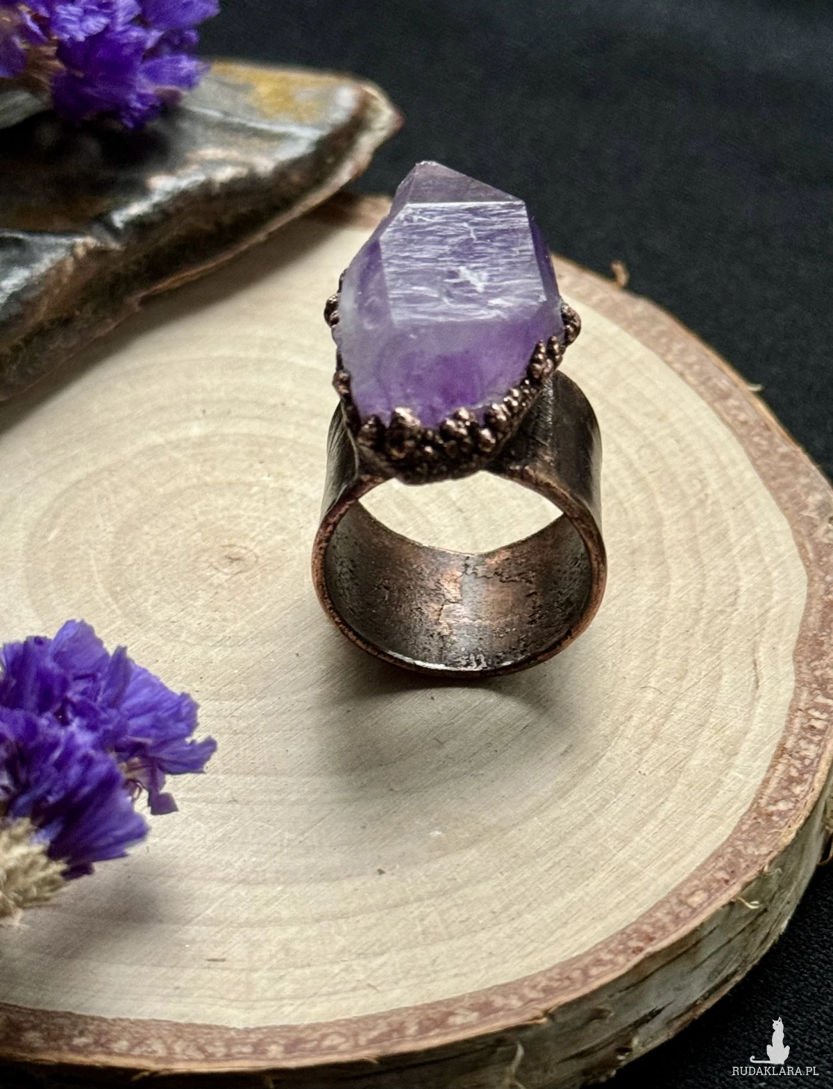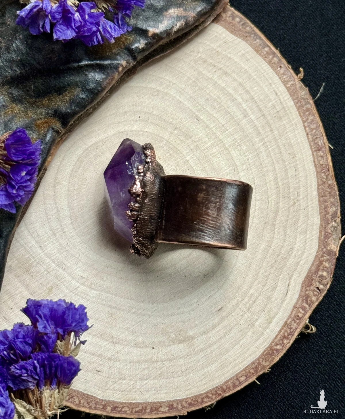Miedziany pierścień z ametystem. Rozmiar 27 (obwód 67mm)