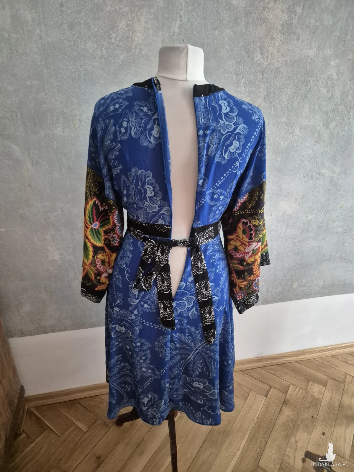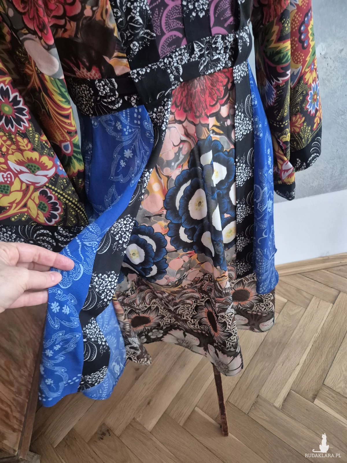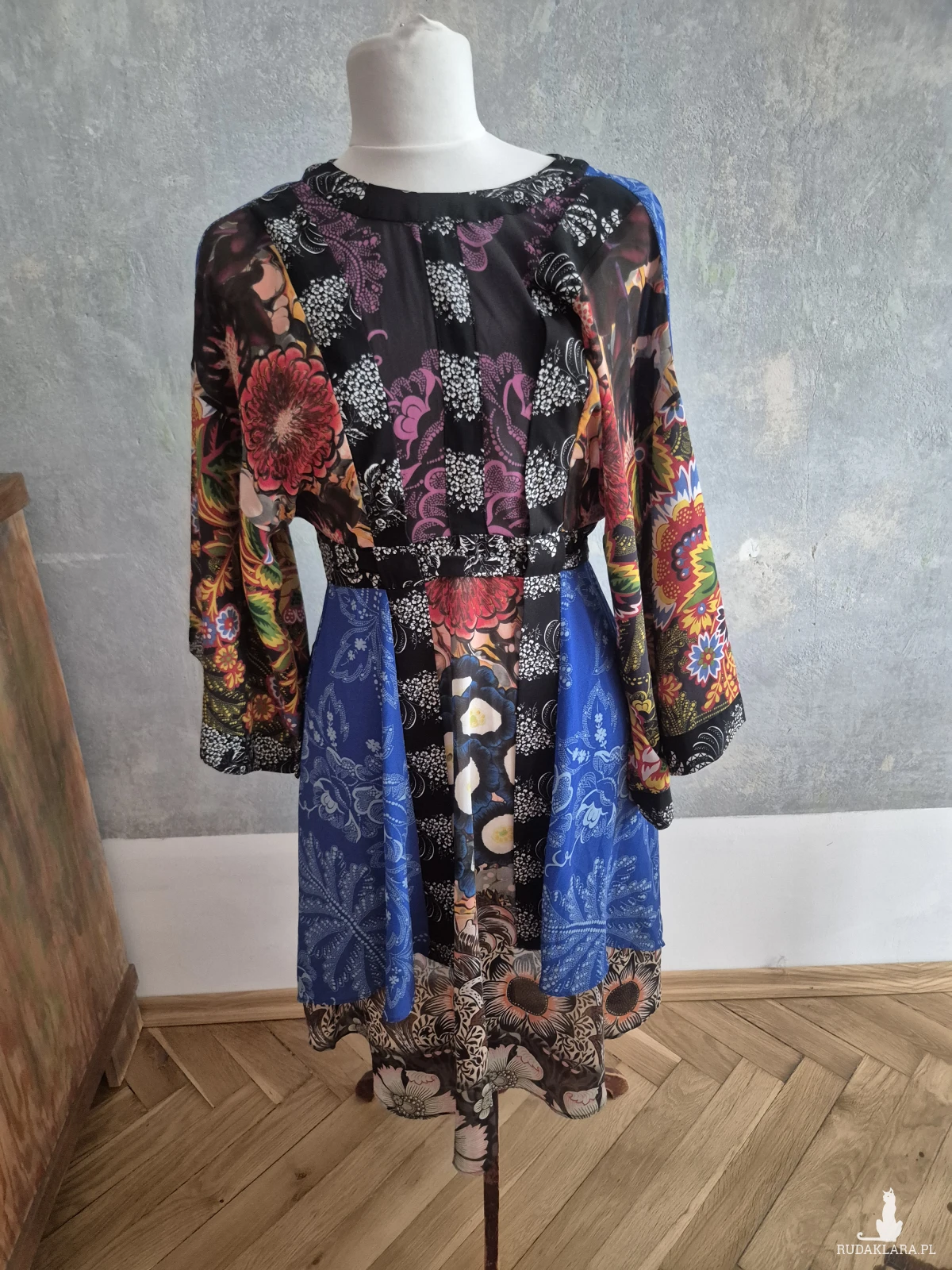 Sukienka firmy Desigual rozmiar 38 w pasie 74 cm w biuście luźna 100 cm długość całości sukienki do 117 cm zapinana z tyłu na zamek wielowarstwowa wielokolorowa długość rękawa 35 cm piękna polecam