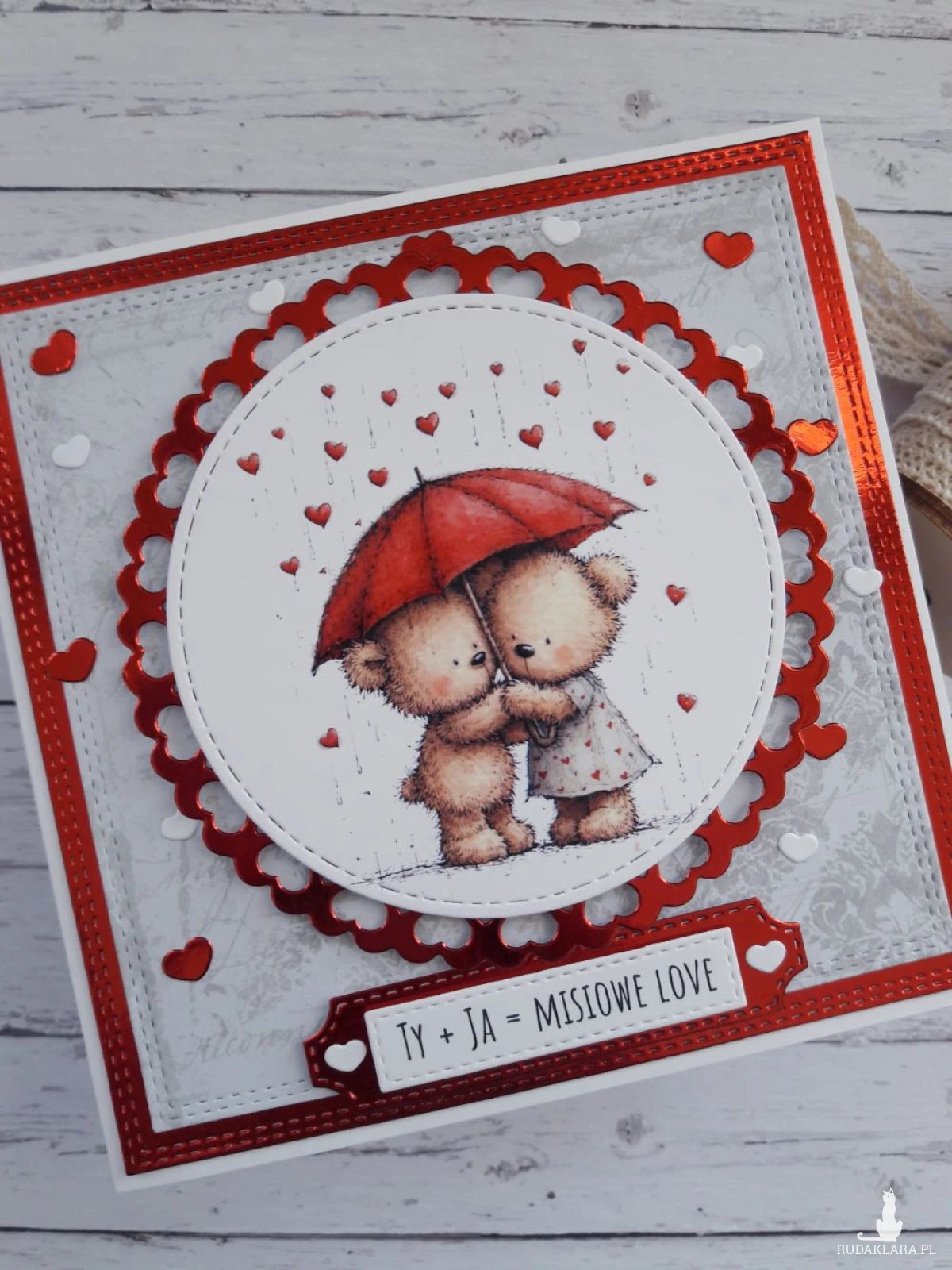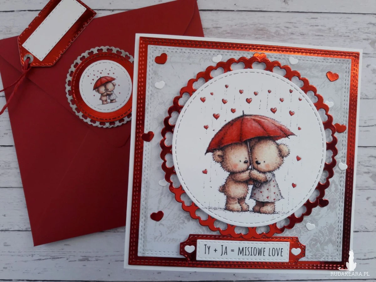 Ręcznie robiona kartka walentynkowa z uroczymi misiami pod parasolką wykonana metodą scrapbookingu z wykorzystaniem profesjonalnych materiałów i z dbałością o każdy szczegół.