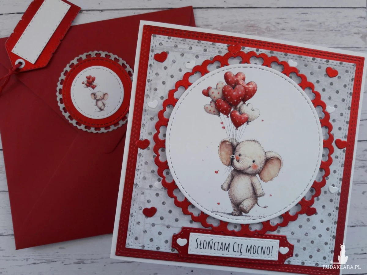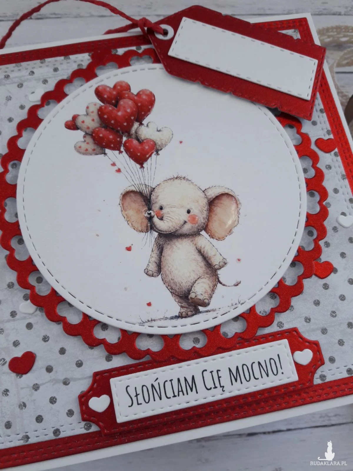 Ręcznie robiona kartka walentynkowa z uroczym słoniem wykonana metodą scrapbookingu z wykorzystaniem profesjonalnych materiałów i z dbałością o każdy szczegół.