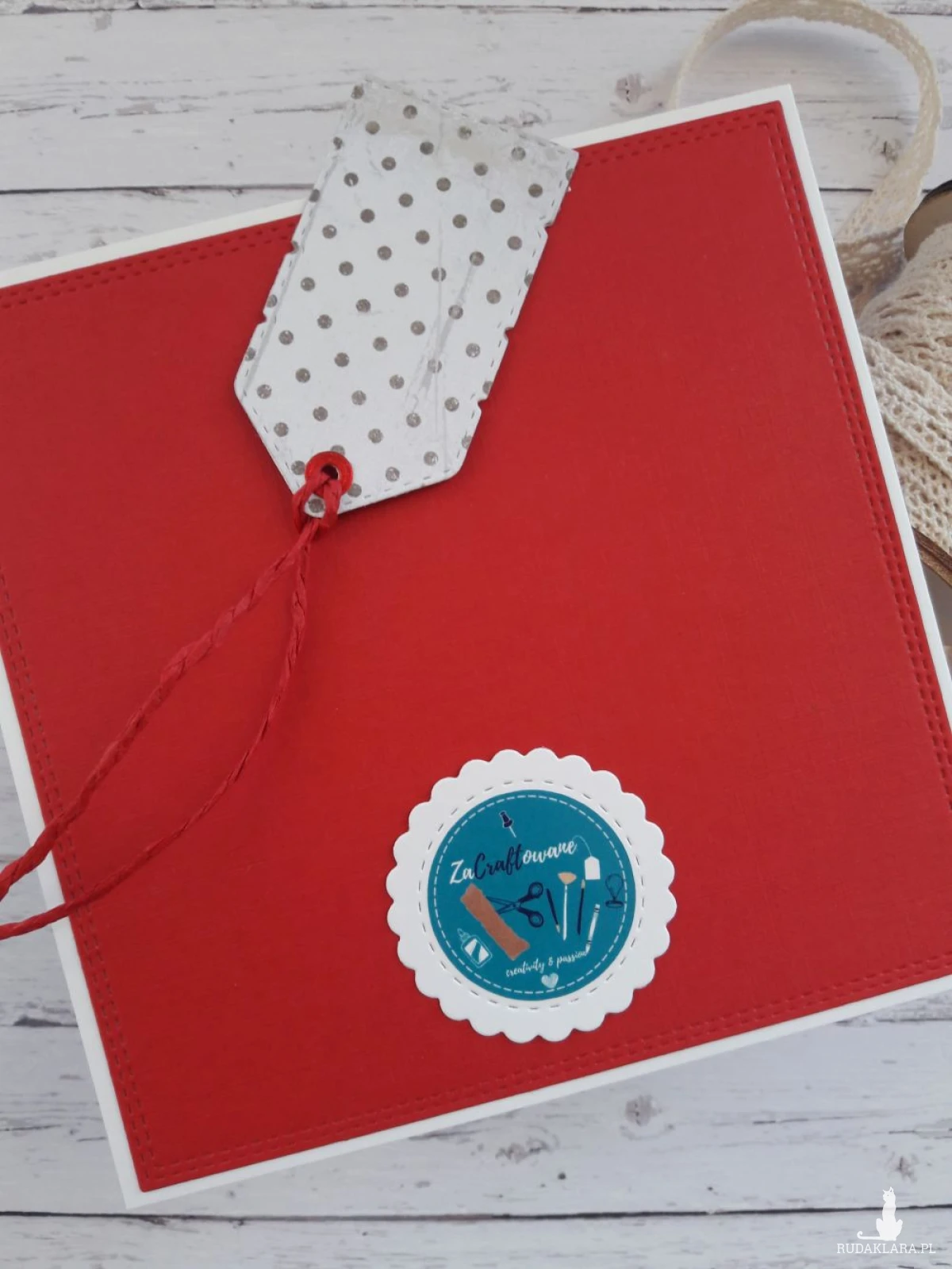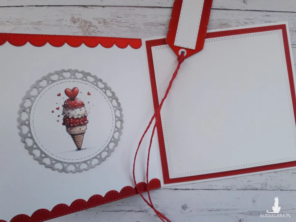 Do kartki dołączam GRATIS w postaci widocznej na zdjęciu etykietki, za pomocą której można podpisać upominek walentynkowy i przyczepić ją do wstążki, którą obwiązany jest prezent, za pomocą sznureczka, który również znajduje się w zestawie.