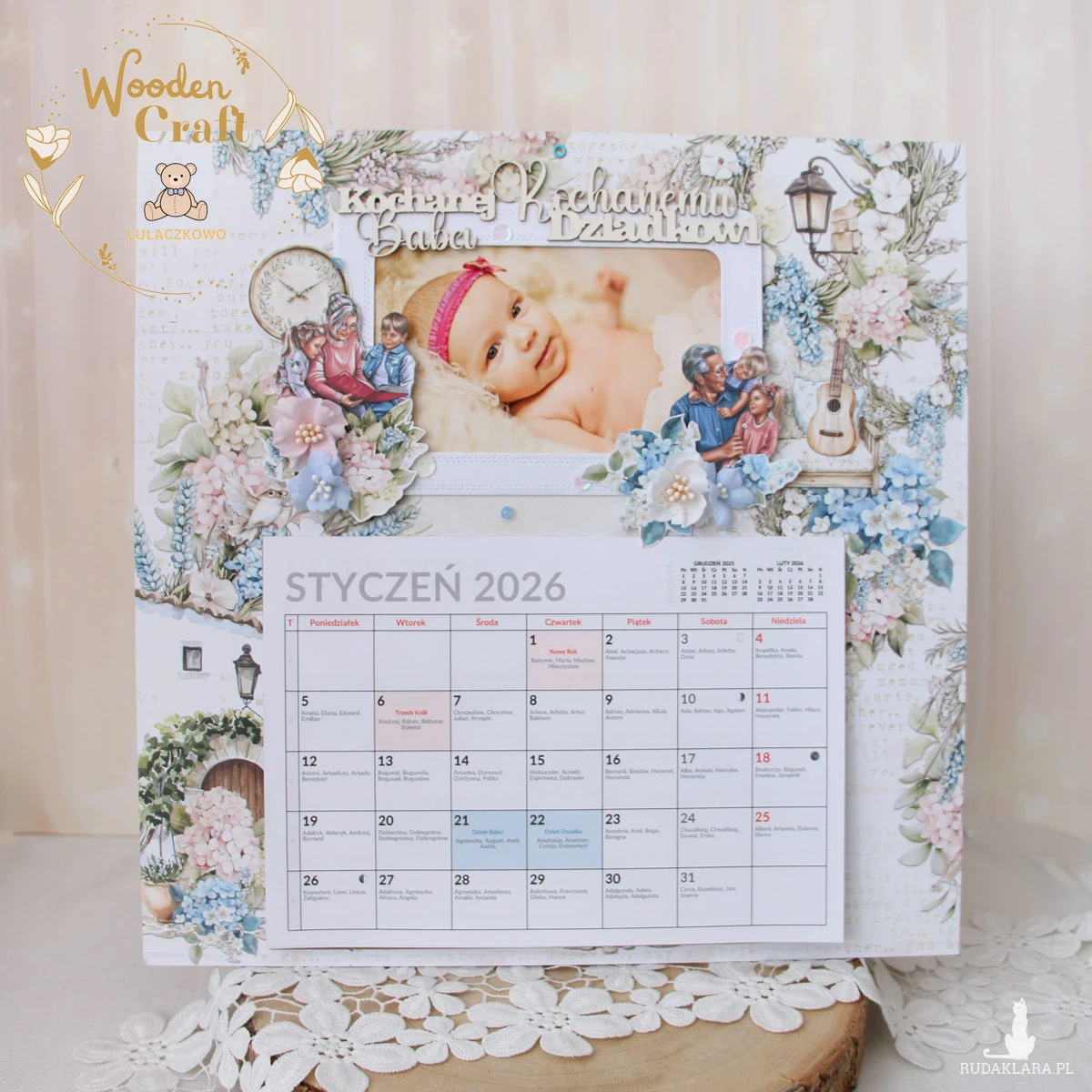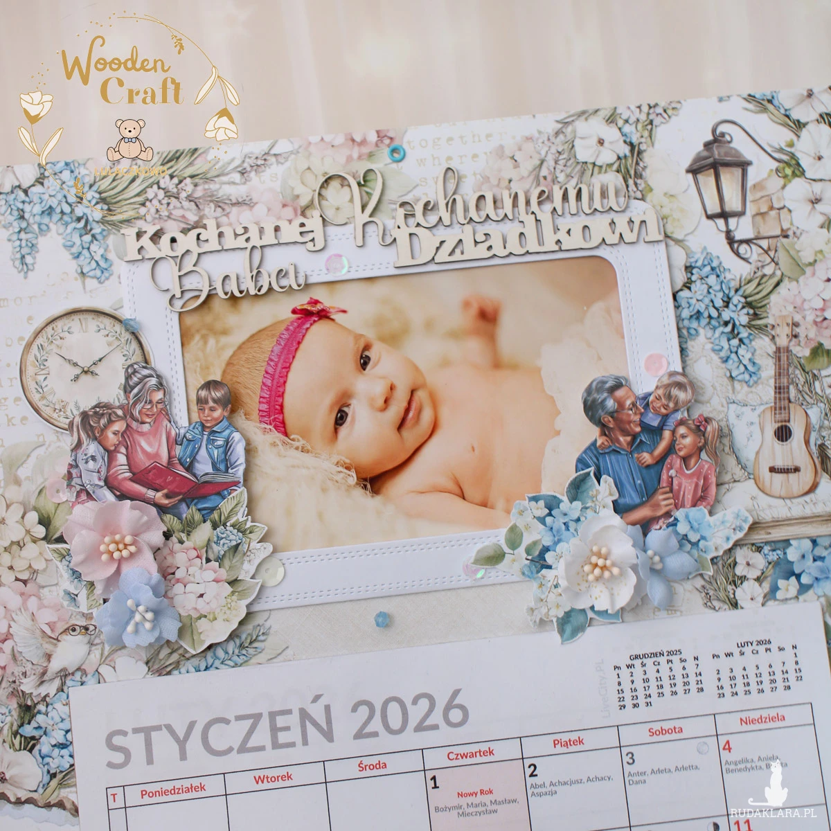 Piękny, ręcznie robiony kalendarz z miejscem na zdjęcie, idealny jako prezent na Dzień Babci Dziadka, utrzymany w odcieniach bieli, błękitu i różu, wykonany z cudownej kolekcji papierów "Cottage Heart". Kalendarz wykonany ręcznie z dbałością o każdy szczegół, ozdobiony grafikami babci oraz dziadka z wnuczętami, kompozycjami kwiatowymi z ręcznie robionych kwiatów, dodatkowo zdobiony połyskującymi cekinami, oraz tekturkowymi napisami "Kochanej Babci" i "Kochanemu Dziadkowi".