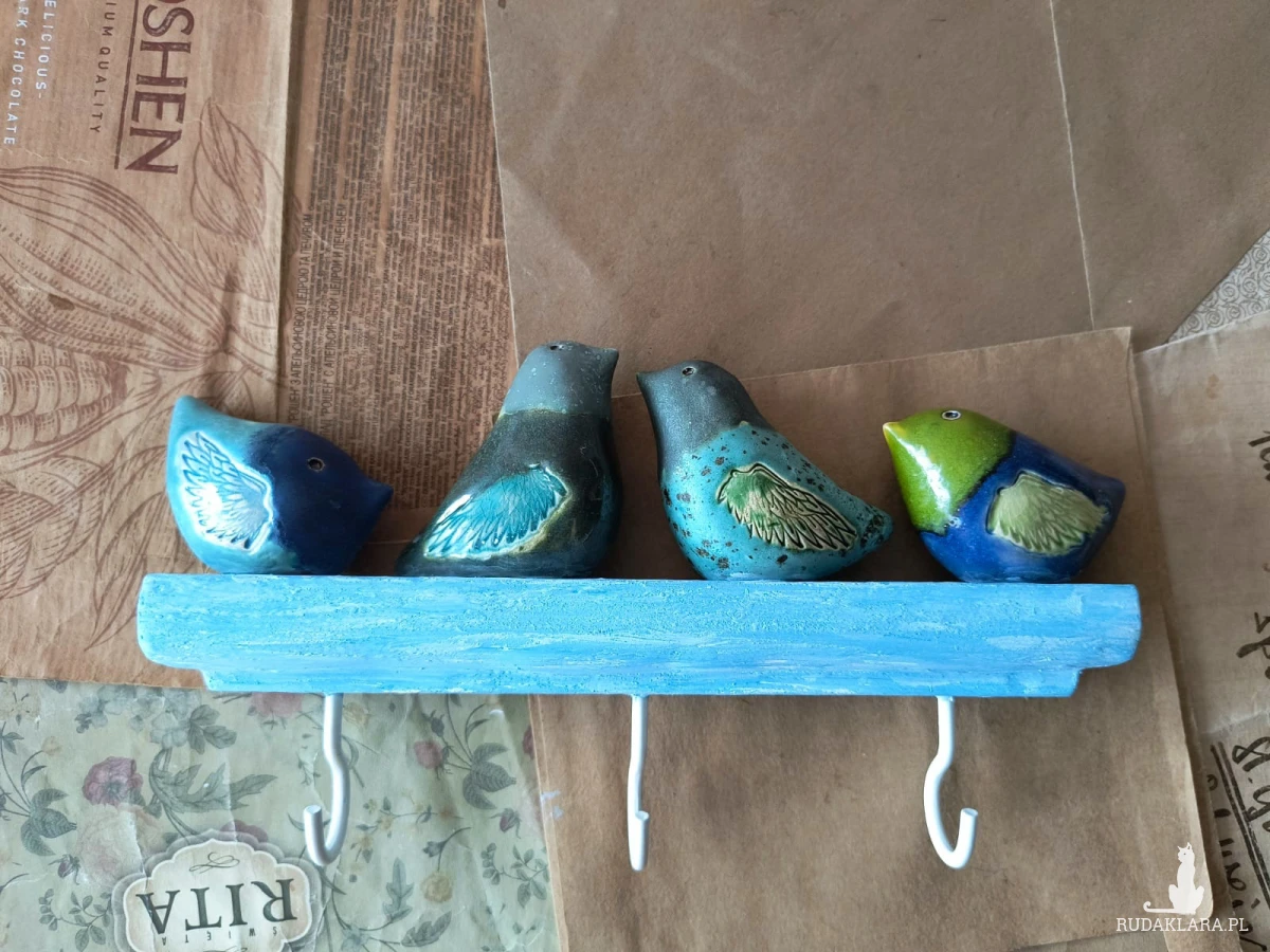 Stylizowany wieszak drewniany o długości 20 cm, z delikatnym frezem, na 3 haczyki, ozdobiony ceramicznymi ptaszkami wykonanymi z gliny ceramicznej. Dodatki wypalone zostały na biskwit, a następnie poszkliwione w temperaturze 1260 stopni C. Z tytułu wygodne mocowanie w postaci zawieszek. Serdecznie polecam!!!
