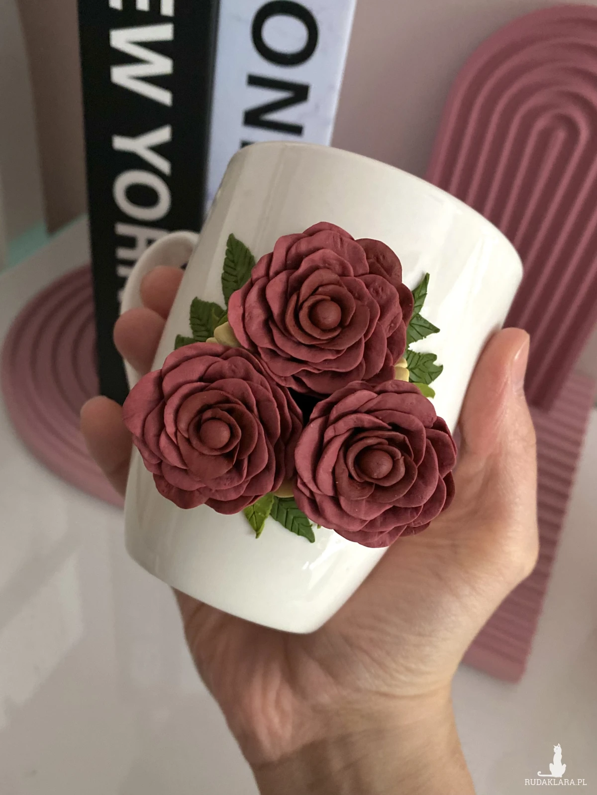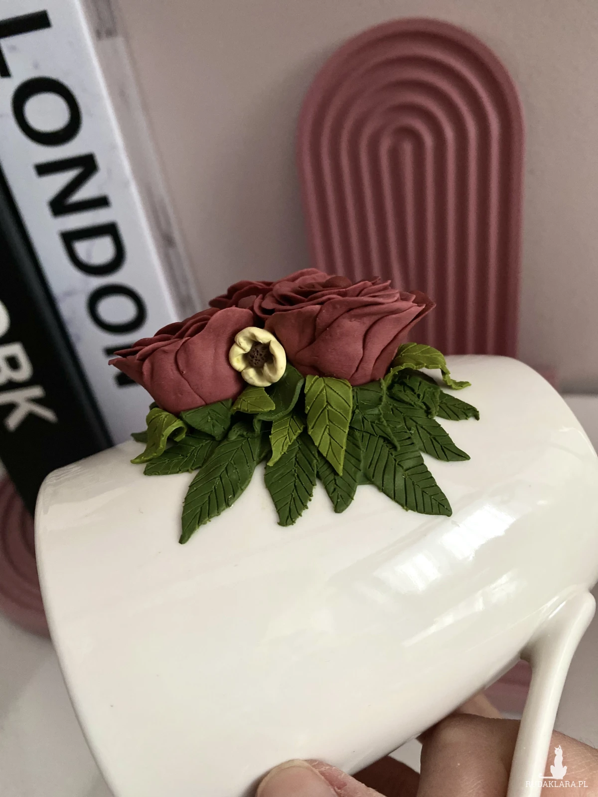 Kubek ceramiczny w kolorze złamanej bieli/ kości słoniowej/ kremowym z ręcznie tworzonym dekorem z gliny polimerowej