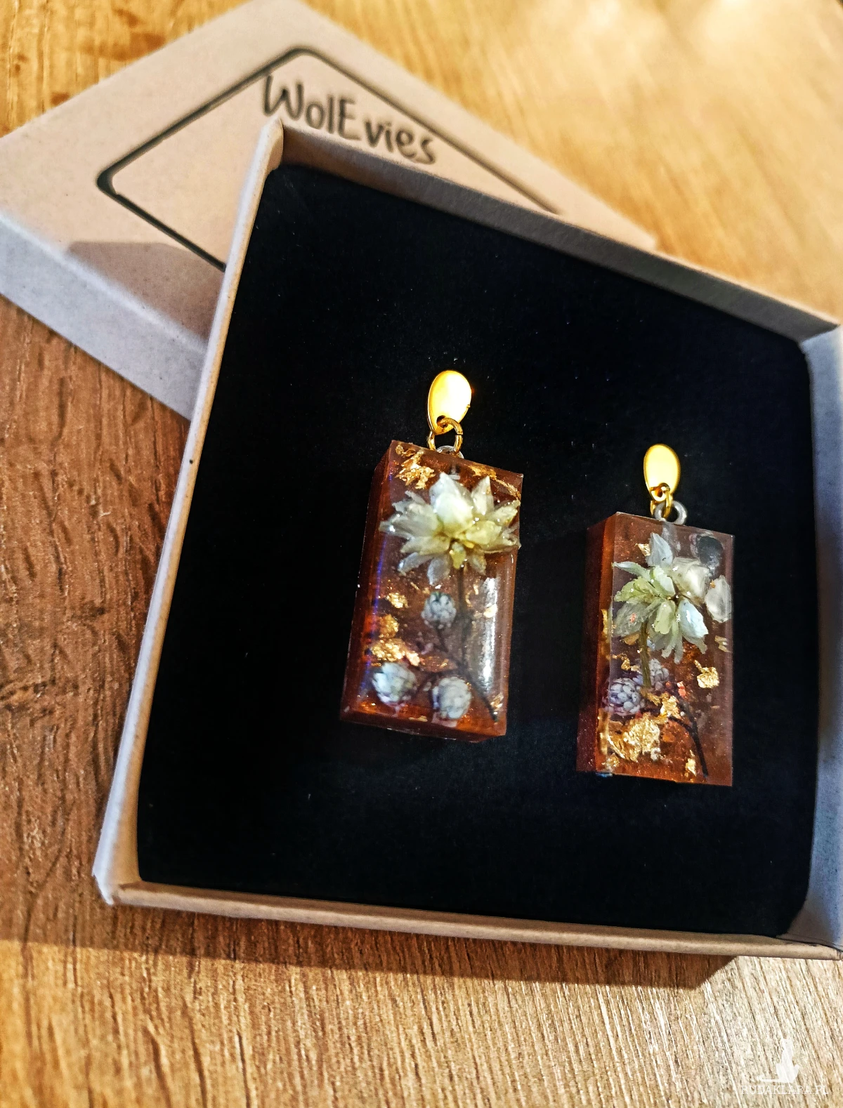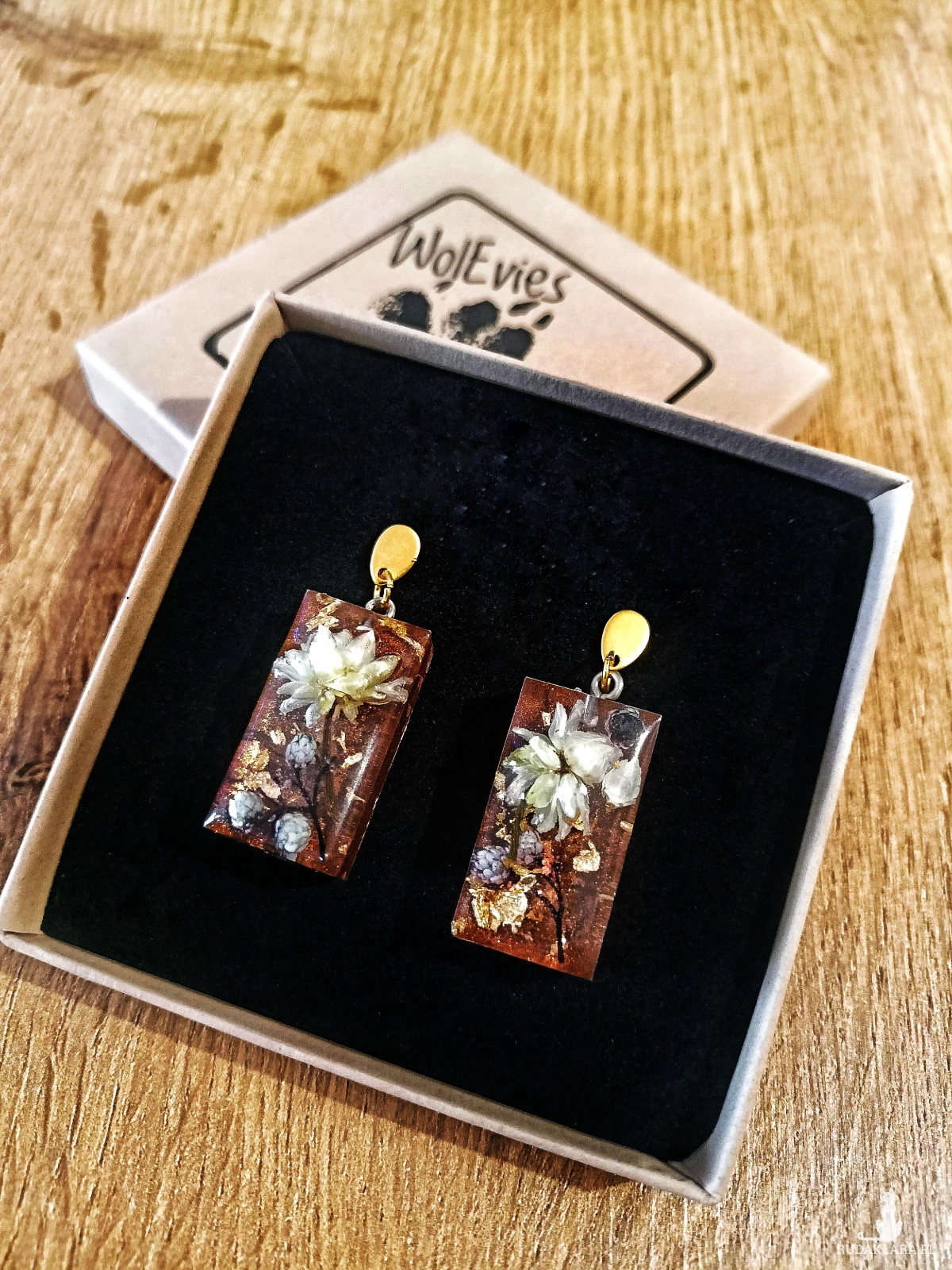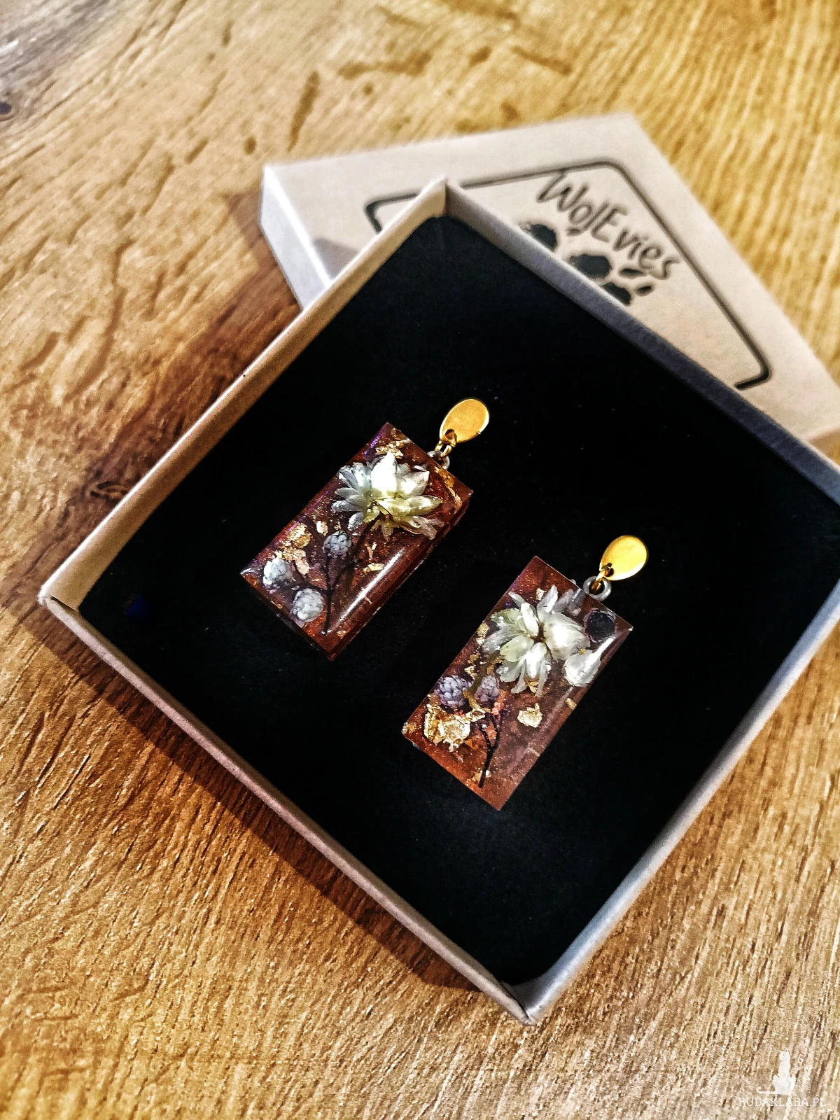 Oferuję wyjątkowe kolczyki ręcznie wykonane, w których zatopiono prawdziwe suszone białe kwiaty kocanki oraz niebieski kwiat ryżu. Kompozycję dopełnia transparentna i perłowa, brązowa, delikatnie mieniąca się żywica Resin Pro oraz złote drobinki, nadające całości eleganckiego blasku.