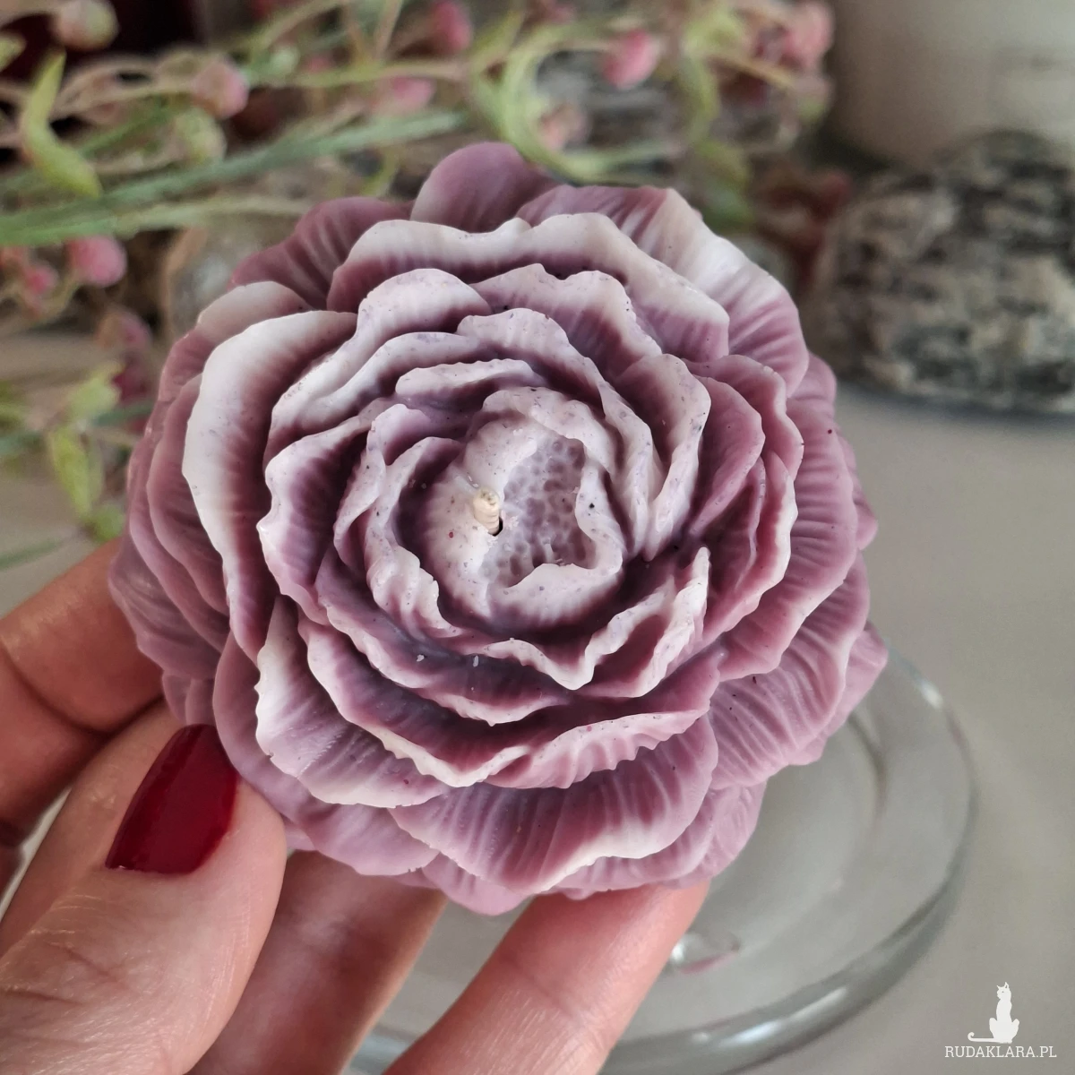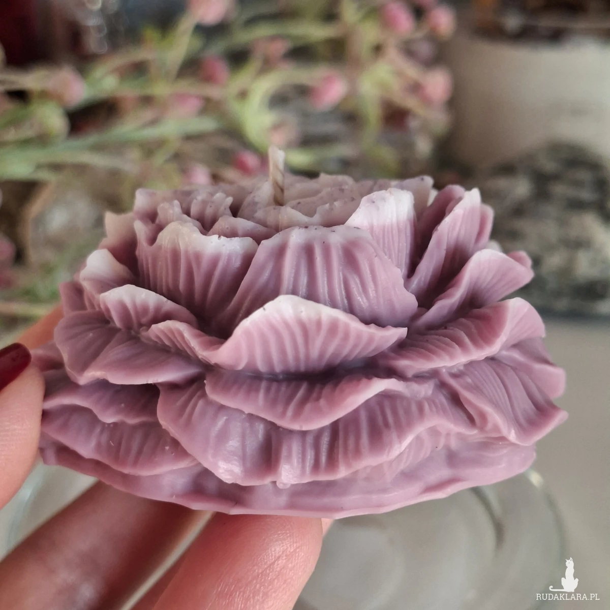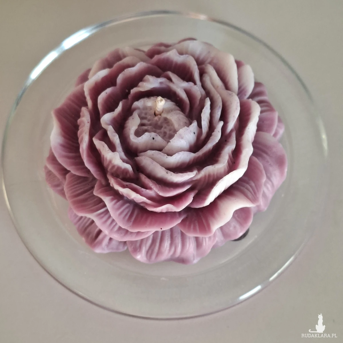 Świeca zapachowa w kształcie piwonii o zapachu piwonii i kawy. Idealna jako upominek w ramach podziękowania dla gości na specjalne okazje. Wymiary: średnica 7,5 cm; wysokość 3,5 cm.