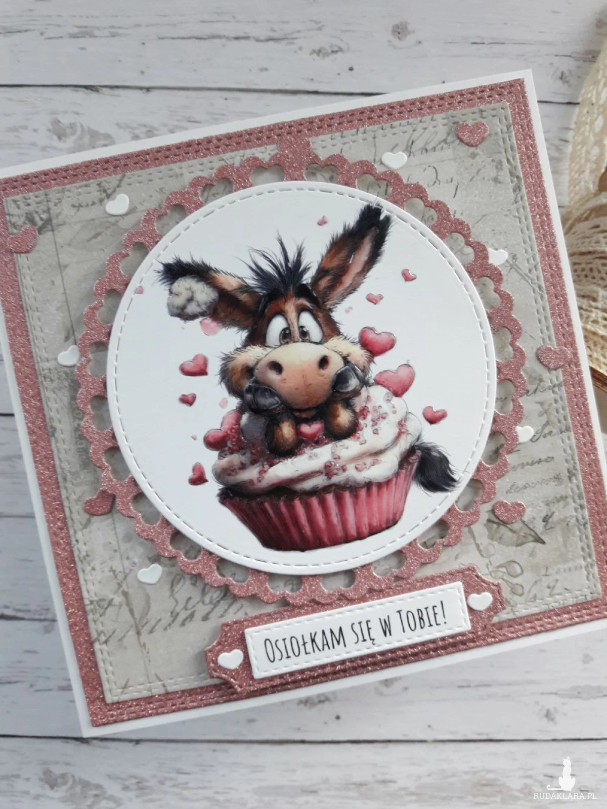 Ręcznie robiona kartka walentynkowa z uroczym osiołkiem wykonana metodą scrapbookingu z wykorzystaniem profesjonalnych materiałów i z dbałością o każdy szczegół.