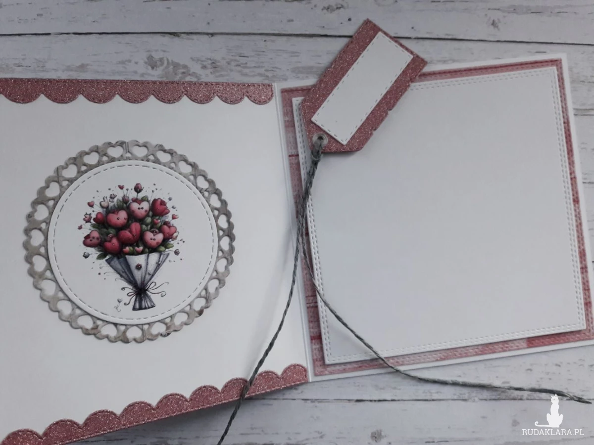 Do kartki dołączam GRATIS w postaci widocznej na zdjęciu etykietki, za pomocą której można podpisać upominek walentynkowy i przyczepić ją do wstążki, którą obwiązany jest prezent, za pomocą sznureczka, który również znajduje się w zestawie.