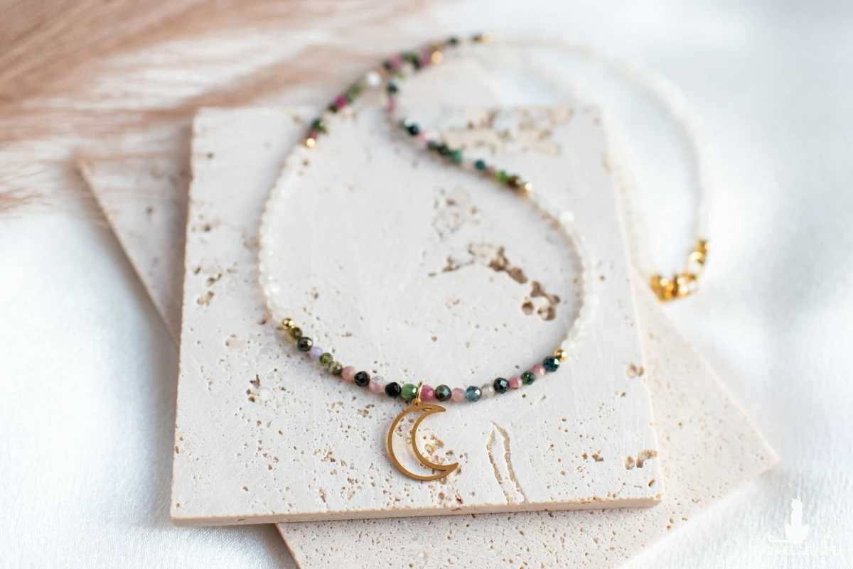 Turmalin symbolizuje ochronę i równowagę, a kamień księżycowy - intuicję, wrażliwość i kobiecą energię.
