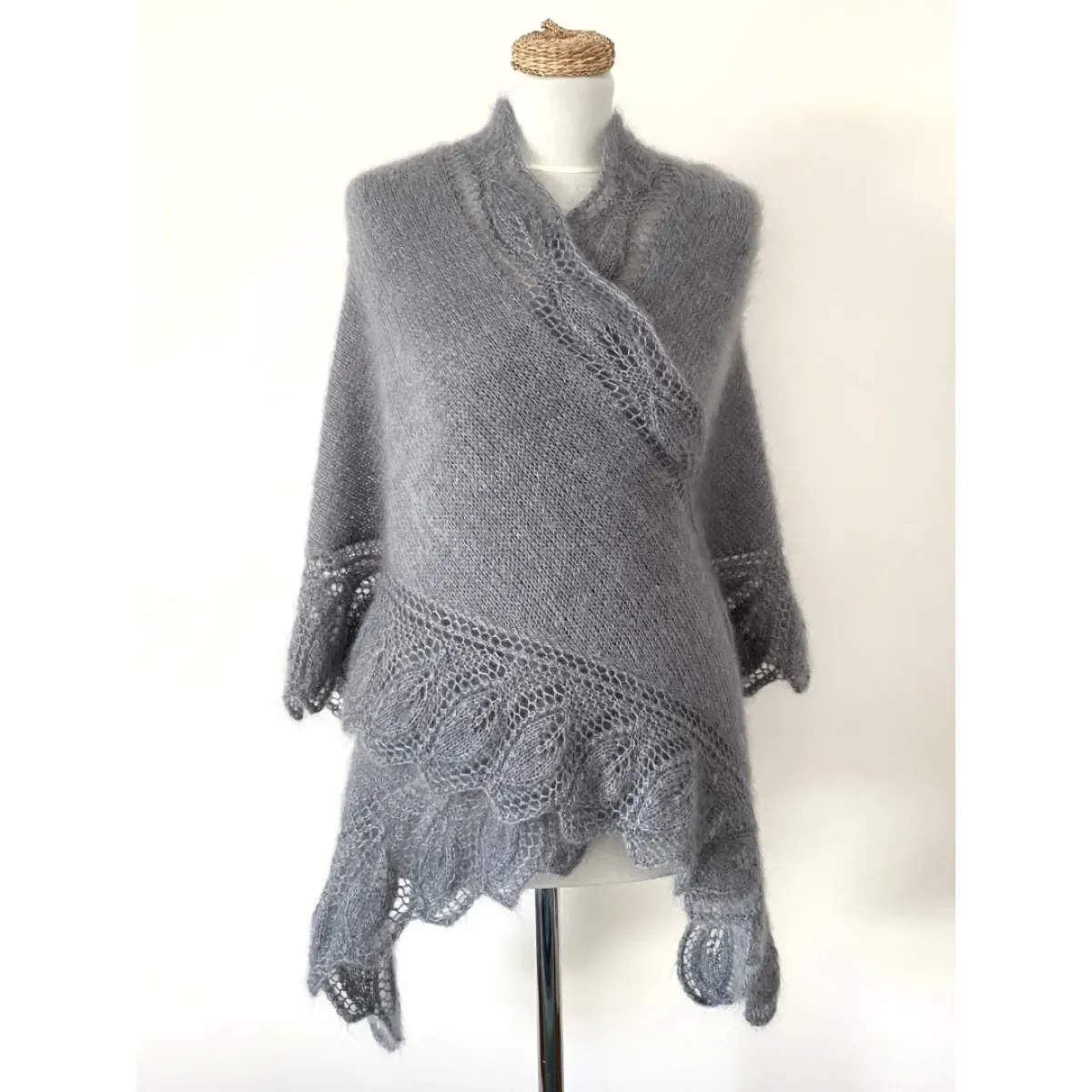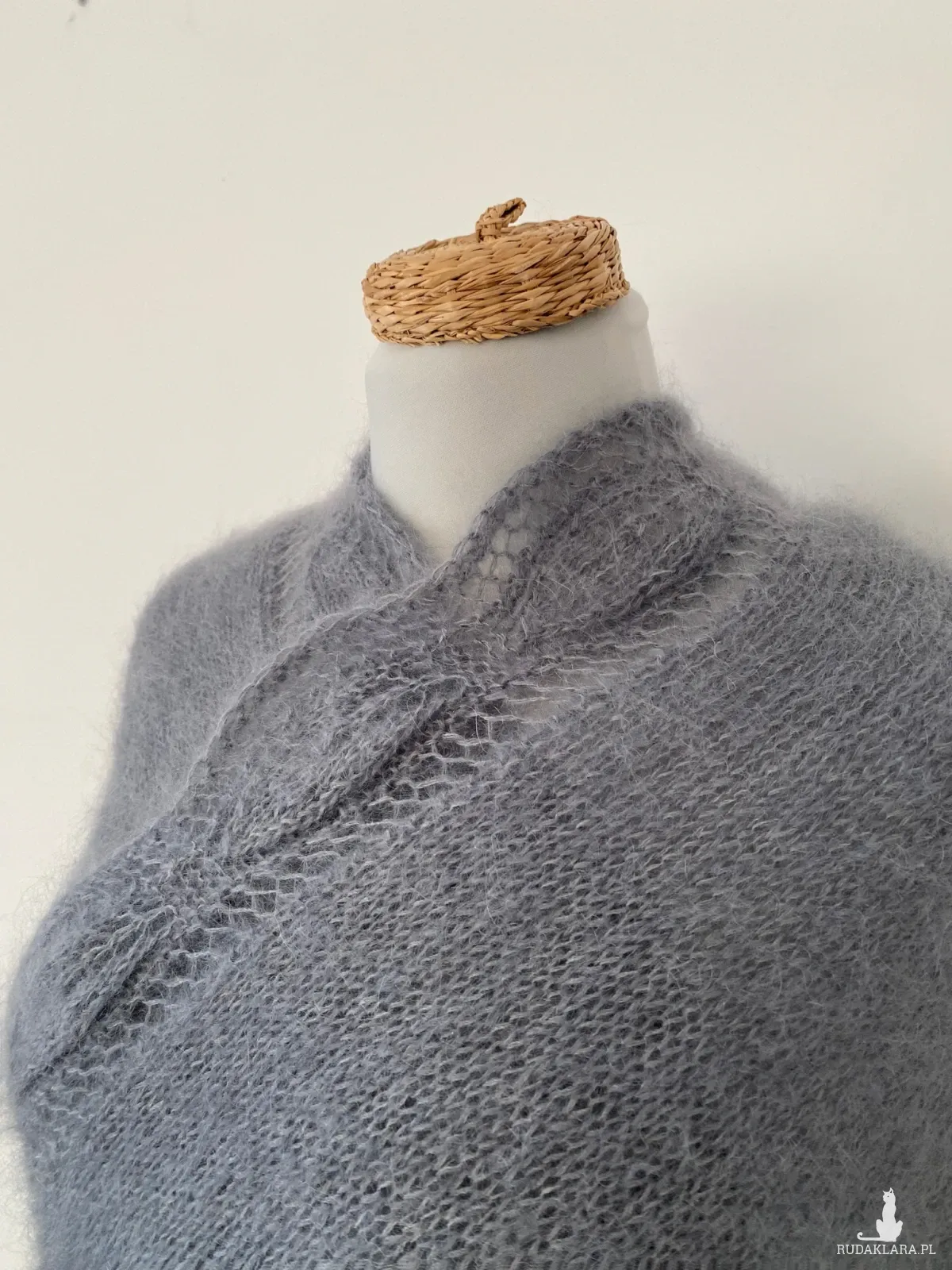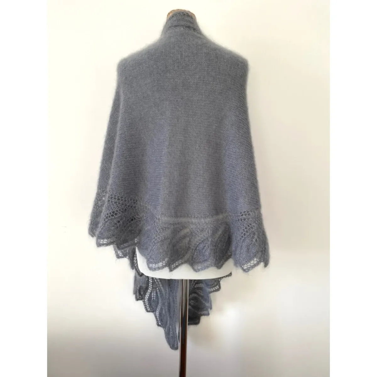 Szal, etola wykonana na drutach w jednym kawałku, łącznie z obramowaniem i lamówką. Wykonany z bardzo miękkiej i luksusowej włóczki – mieszanki moheru i jedwabiu.