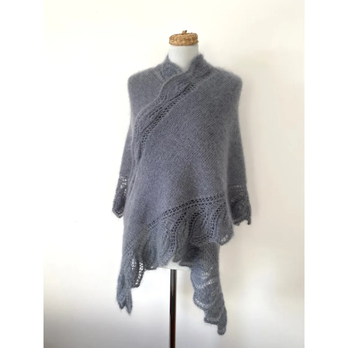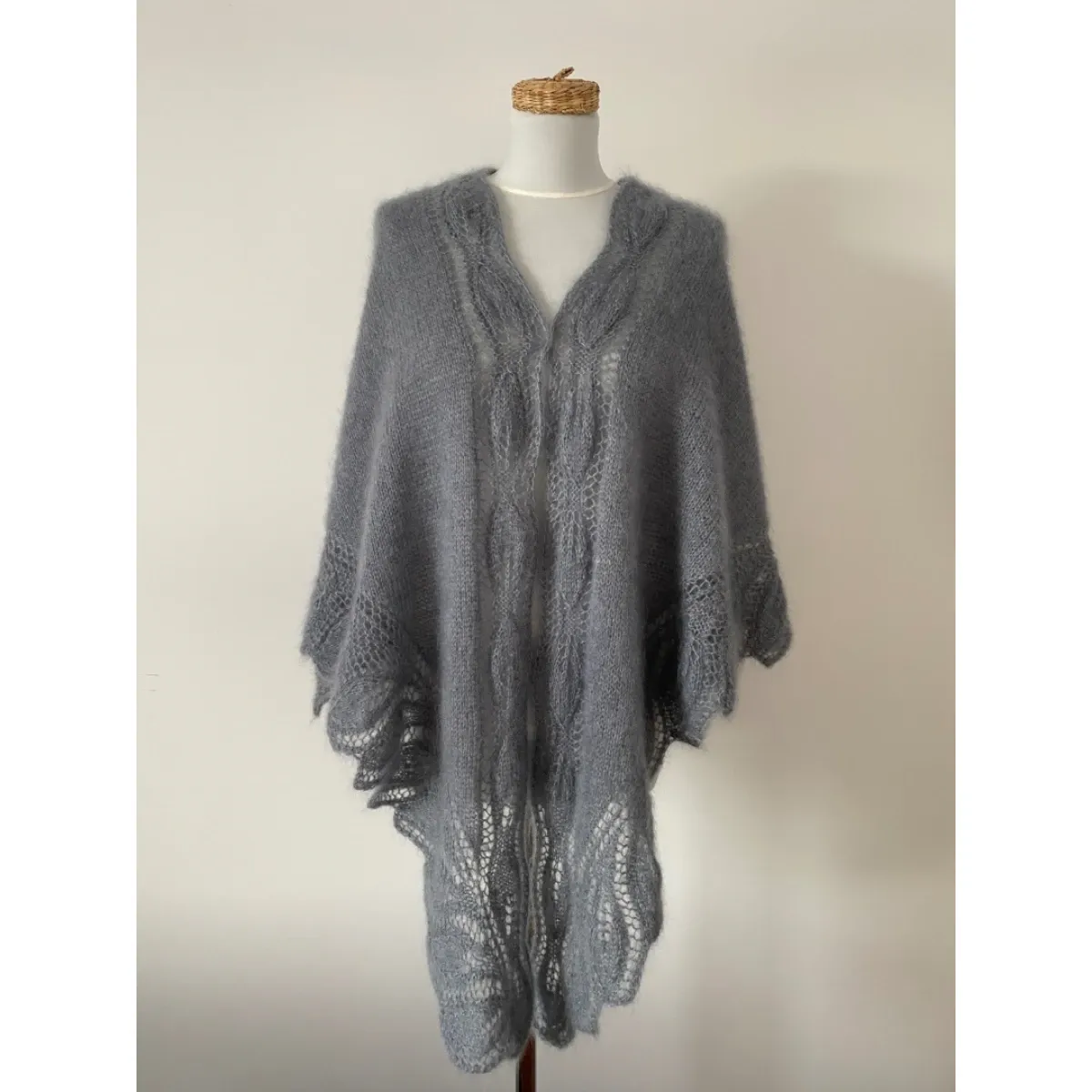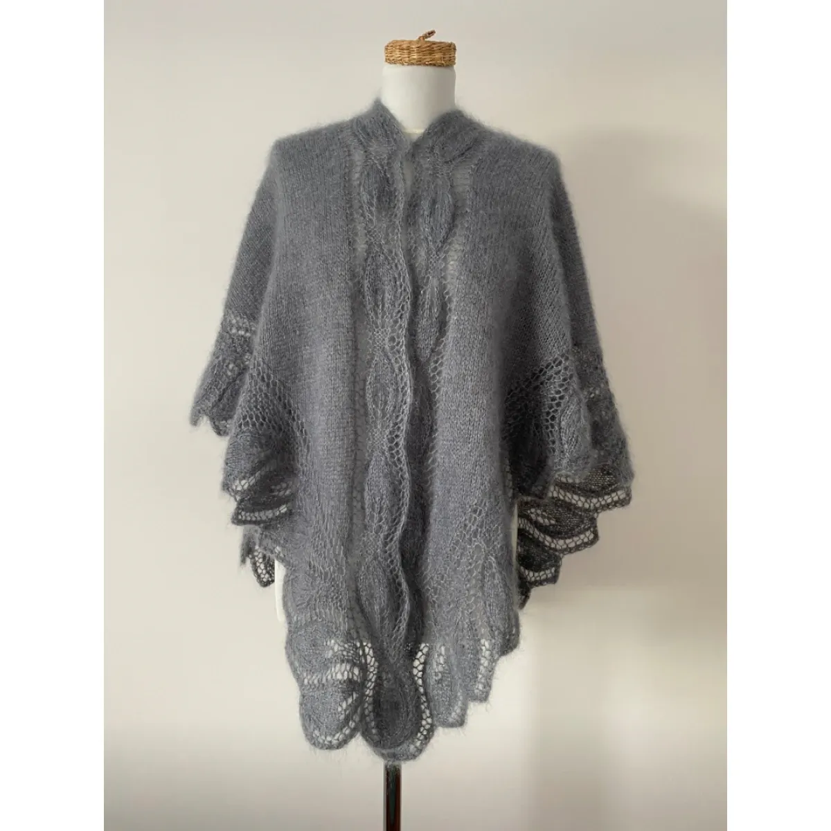 Szal, etola wykonana na drutach w jednym kawałku, łącznie z obramowaniem i lamówką. Wykonany z bardzo miękkiej i luksusowej włóczki – mieszanki moheru i jedwabiu.