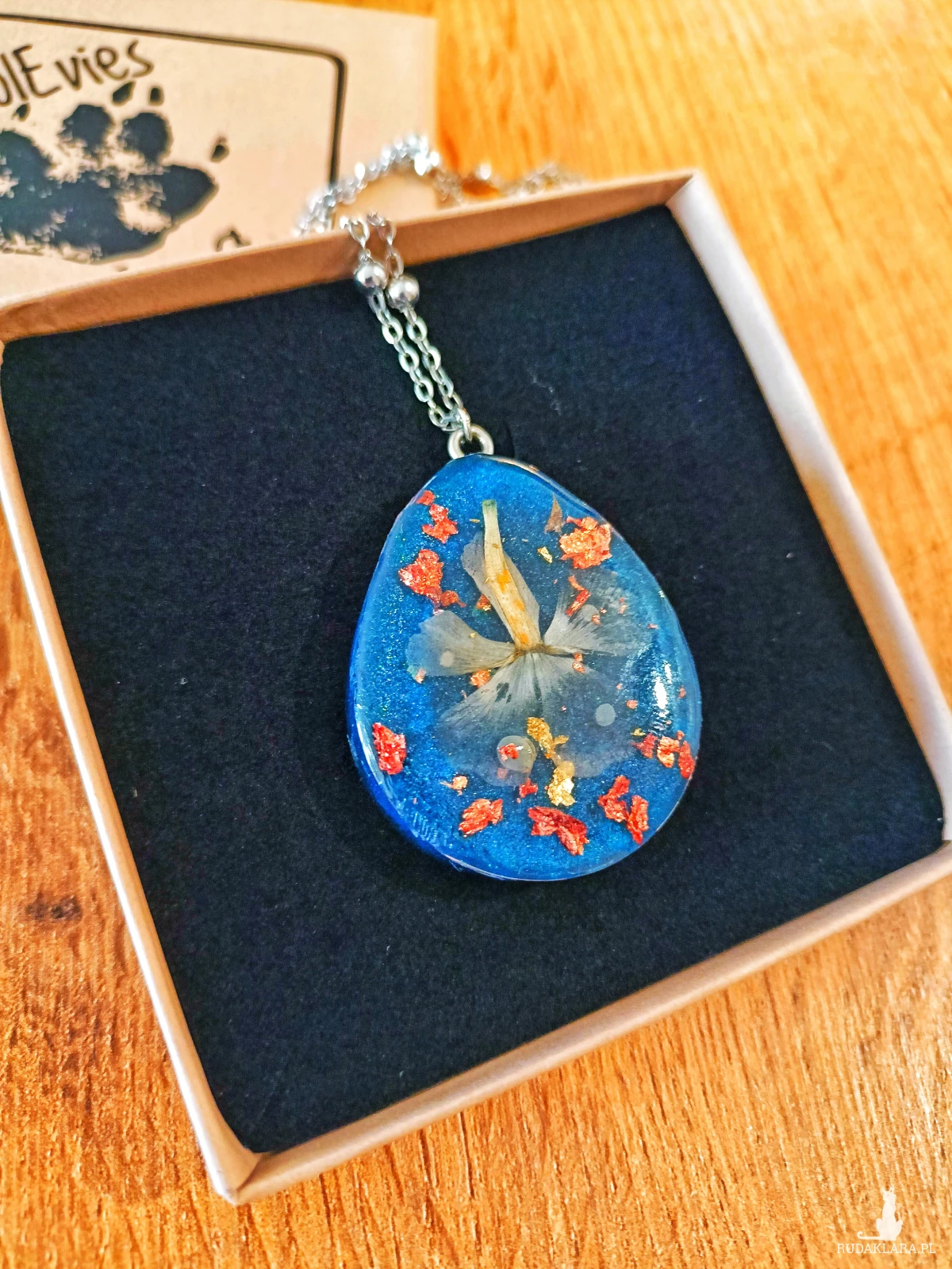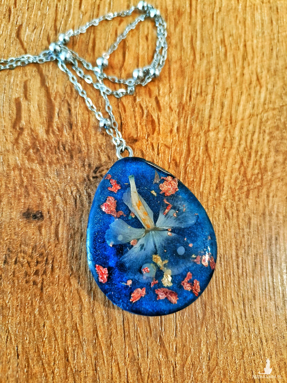 Oferuję unikatowy wisiorek ręcznie wykonany z wysokiej jakości żywicy Resin Pro. W centrum znajduje się prawdziwy suszony biały kwiat, zatopiony w połączeniu transparentnej i granatowej, delikatnie mieniącej się żywicy, uzupełnionej drobinkami koloru miedzi. Całość tworzy elegancką, ponadczasową kompozycję inspirowaną naturą.