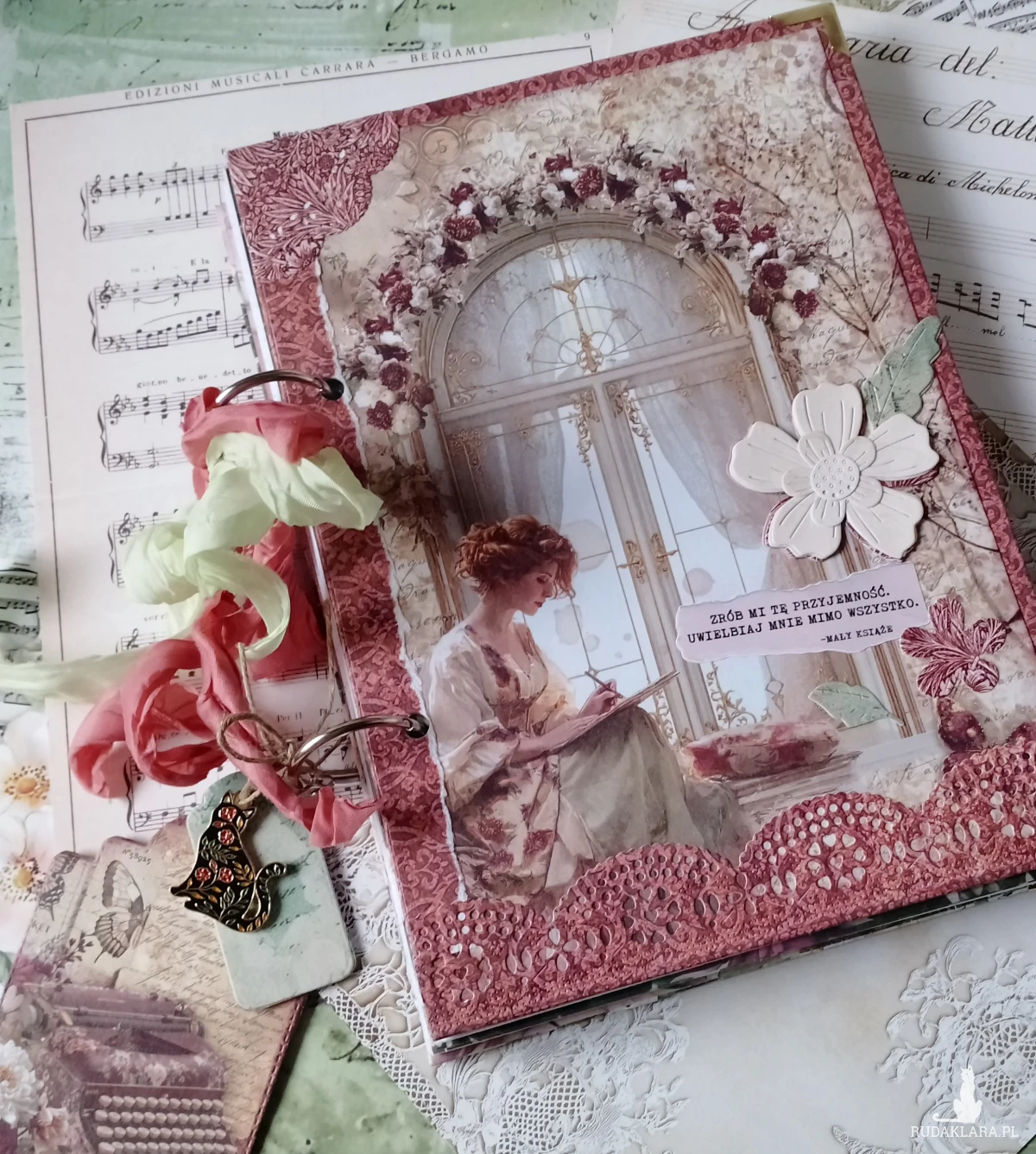 format A5, ok. 1O0 kartek w linie, twarde okładki z tektury introligatorskiej ,dużo detali dekoracyjnych. Wewnętrzne strony okładek z kieszonką, tagi/ etykiety, kalka z kwiatami, metalowa zawieszka iz uroczym kotem, tasiemka bawełniana vintage.