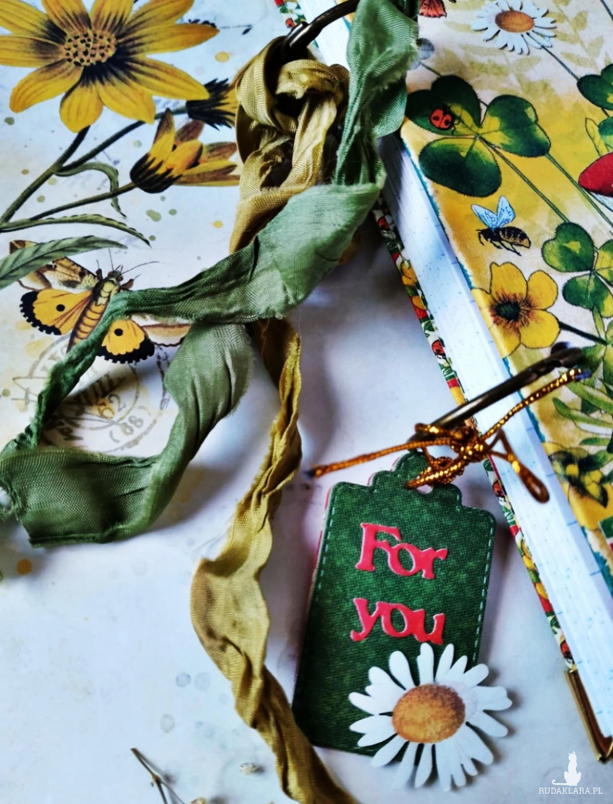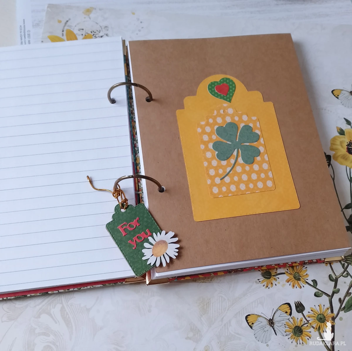 Format A5/100 kartek W środku notesu kieszonki z kolorowymi tagami , zakładka oddzielająca strony, karta z grafiką koniczynek oraz elfów.